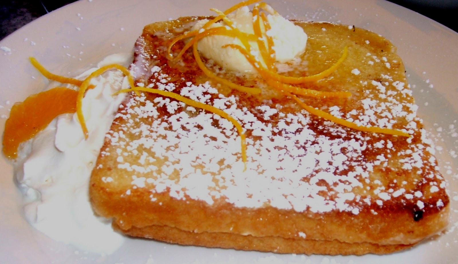 Brandy also decided to indulge her sweet tooth with some Orange and Cream Cheese Stuffed French Toast, which came lovingly presented with some whipped cream and orange zest. The toast was very tender, though not soggy, and the filling had the perfect level of sweetness. Though the flavor combination is certainly one that Brandy had seen before, it certainly made for a very unusual and tasty bit of French Toast.