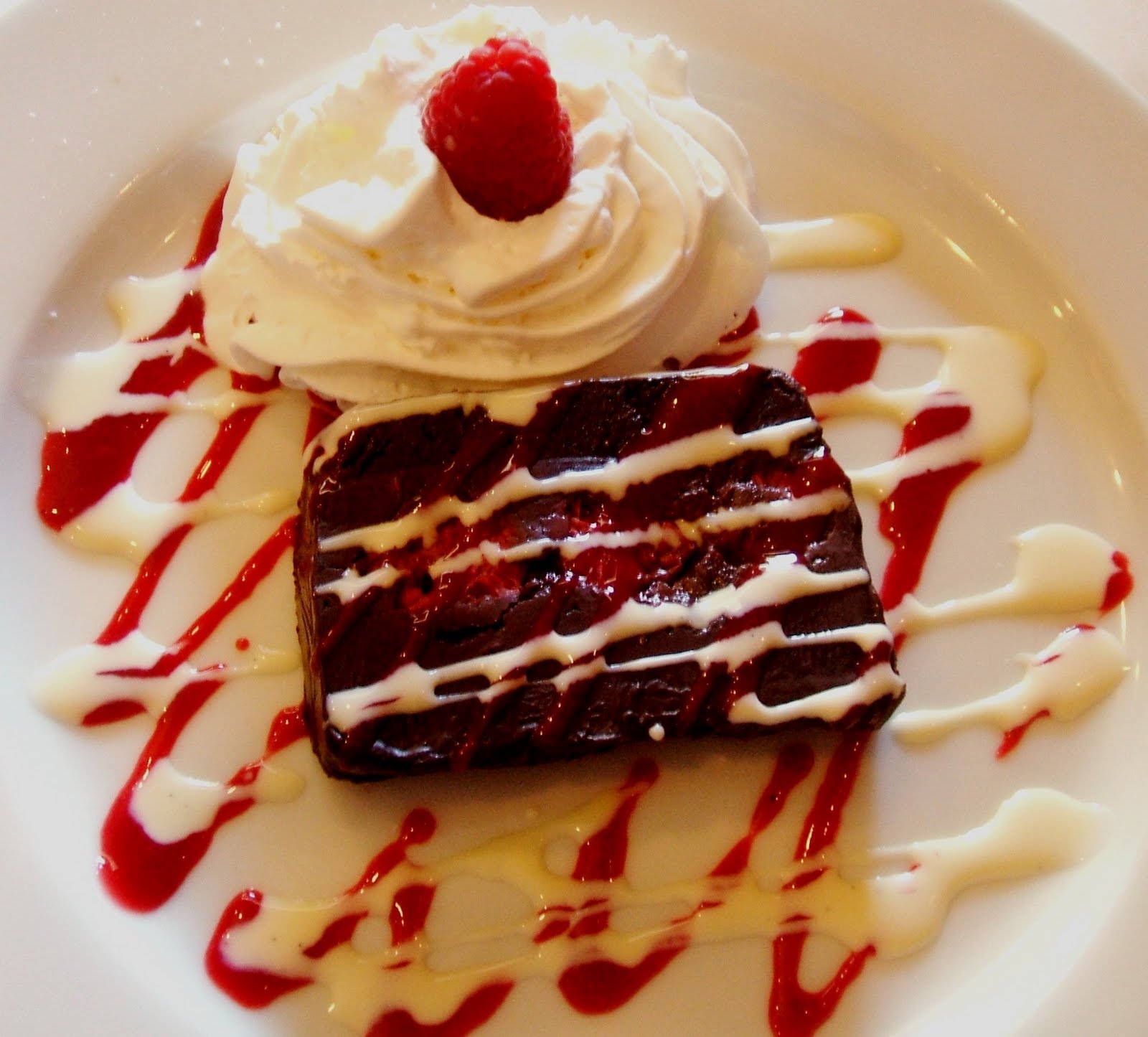 For dessert Brandy picked a terrine of chocolate, espresso, and raspberries. The chocolate itself was fudgey, rather like a flourless chocolate cake, and the raspberries in the middle were brilliantly bright and zippy. The only two disappointments in the dish were that 1) there was really no espresso flavor to be found, and 2) the whipped cream on the plate seemed to be from a can. Hardly a French tradition.