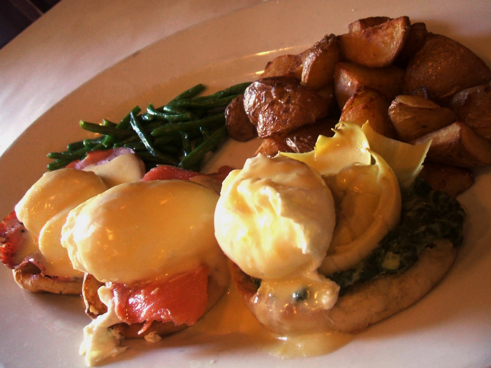 For her entree, Brandy chose to honor her dear Bunny and order a trio of Benedicts, which included a traditional one with Canadian Bacon, a nouveau one with Smoked Salmon, and a reinvented one with spinach and artichoke, all served with green beans and potatoes. The traditional Benedict was just that... very traditional with a well poached egg, grilled meat, and light hollendaise. The salmon one had a lovely smokey flavor, but was otherwise again very traditional. The standout for Brandy was the spinach and artichoke, although she found the spinach mixture a little dry and the artichoke slightly cold and oddly tasting of liquorish. The potatoes also had an odd sweetness that wasn't entirely unwelcome, and the green beans if not for being salty would have been fairly bland.