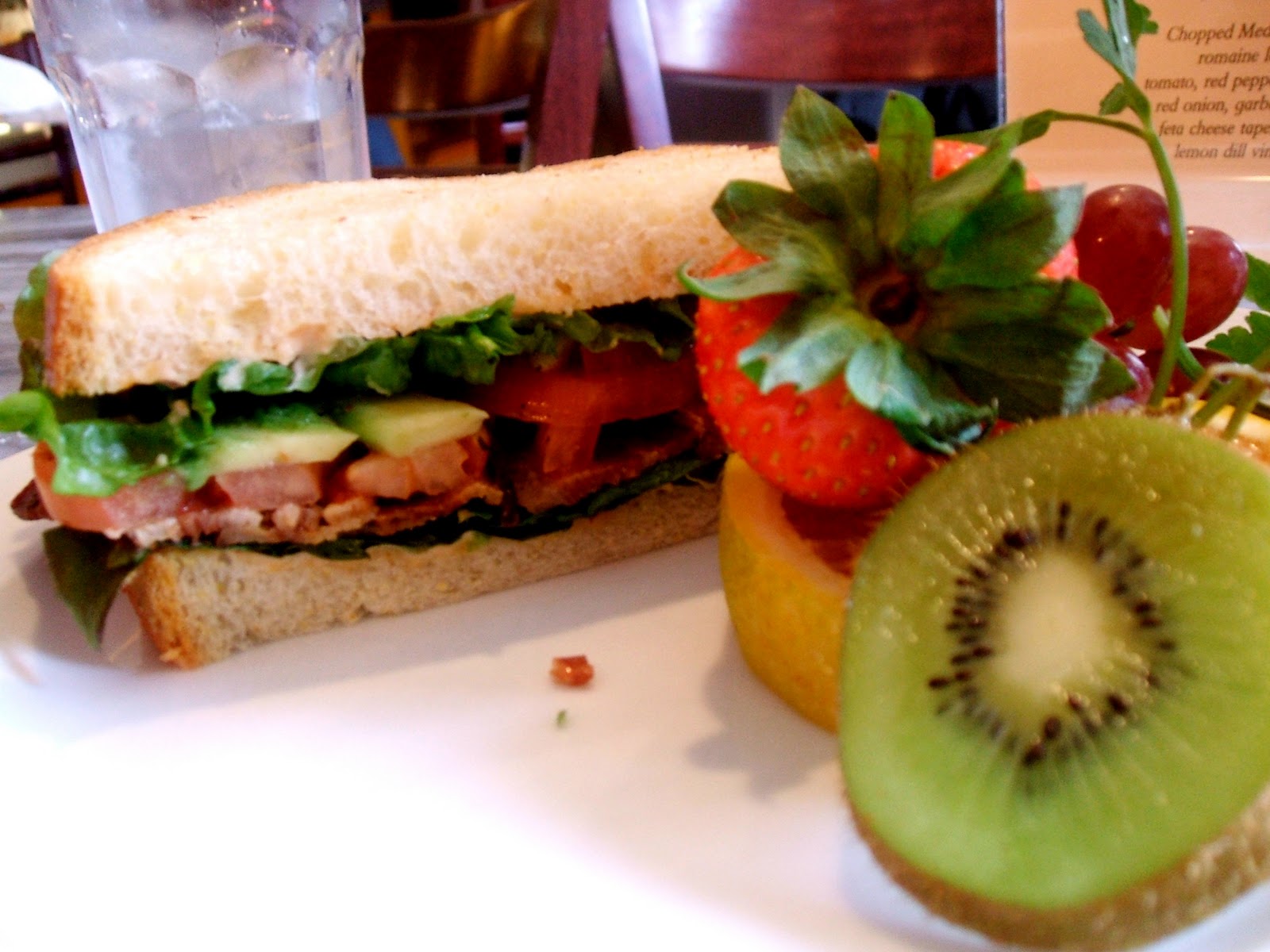 Following that was a modified BLT, coming served with a little bit of avocado and some chipotle mayo. The bread was soft and scrumptious, reminding Brandy of the kind of thing she used to make cucumber sandwiches with during tea time. Crisp, smokey bacon combined with the thinly sliced, juicy tomato, creamy avocado,and crisp lettuce to form a perfect combination of textures, and the little hint of spice from the mayo really brought out all of the best flavors from the simple ingredients. A lovely selection of fruit was also provided as a side.