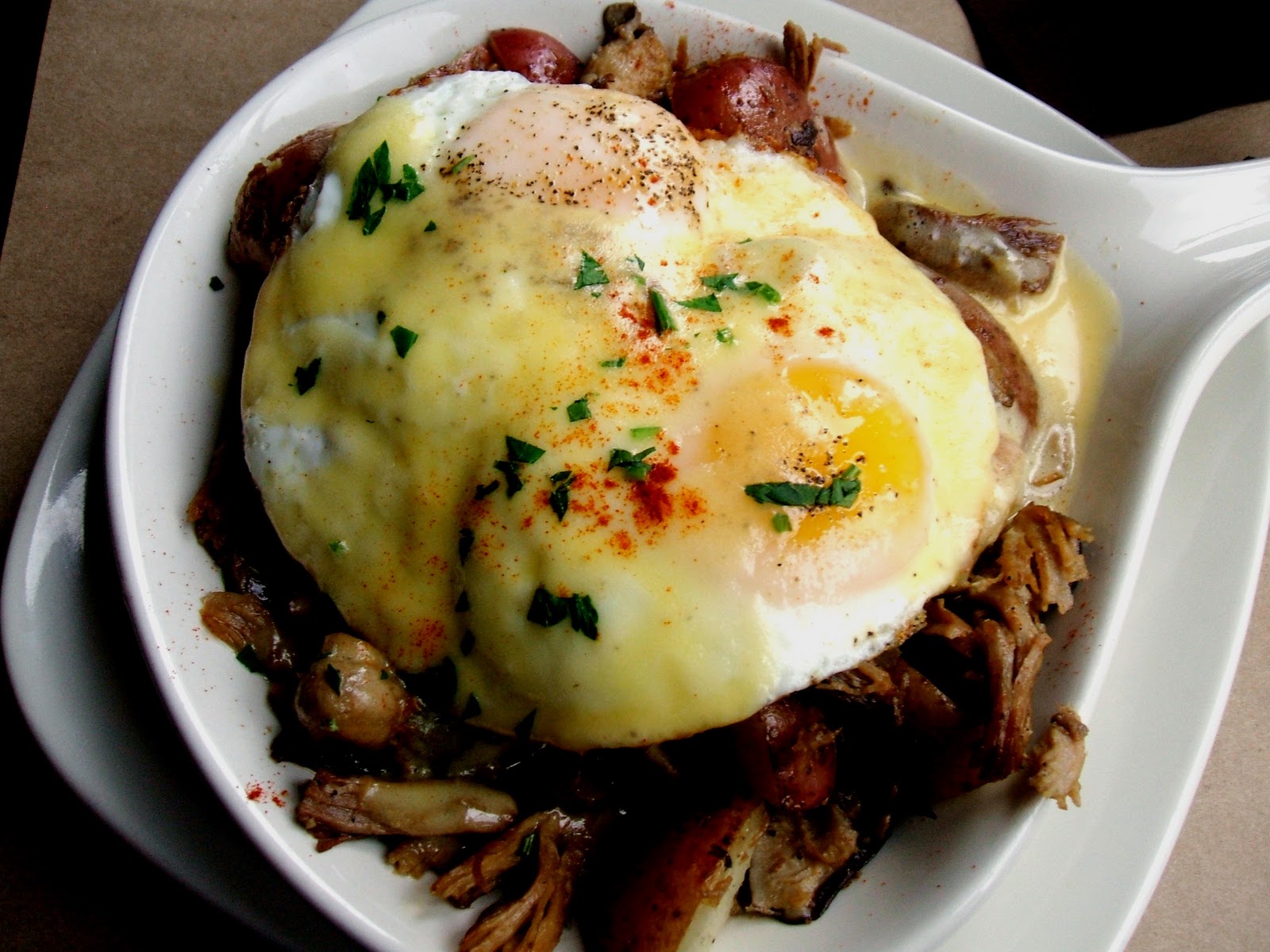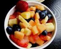 Biscuit chose the Duck Hash, a hearty plate with potatoes, bell peppers, shredded duck meat, and two fried eggs. The duck meat proved a little disappointing, being dry and unremarkable, in that any other meat really would have sufficed in the dish, but the peppers lent a very nice flavor and the potatoes were brilliantly creamy. The meal also came with a very lovely and colorful little fruit cup to help cut the richness of the duck fat.