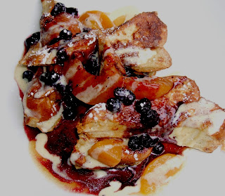 To share, the ladies picked the day's special French Toast, which came served with peach and blueberry compote. Though the corners and edges of the toast were very dry, the middle was nicely moist and soft, and the fruit added a lovely brightness.