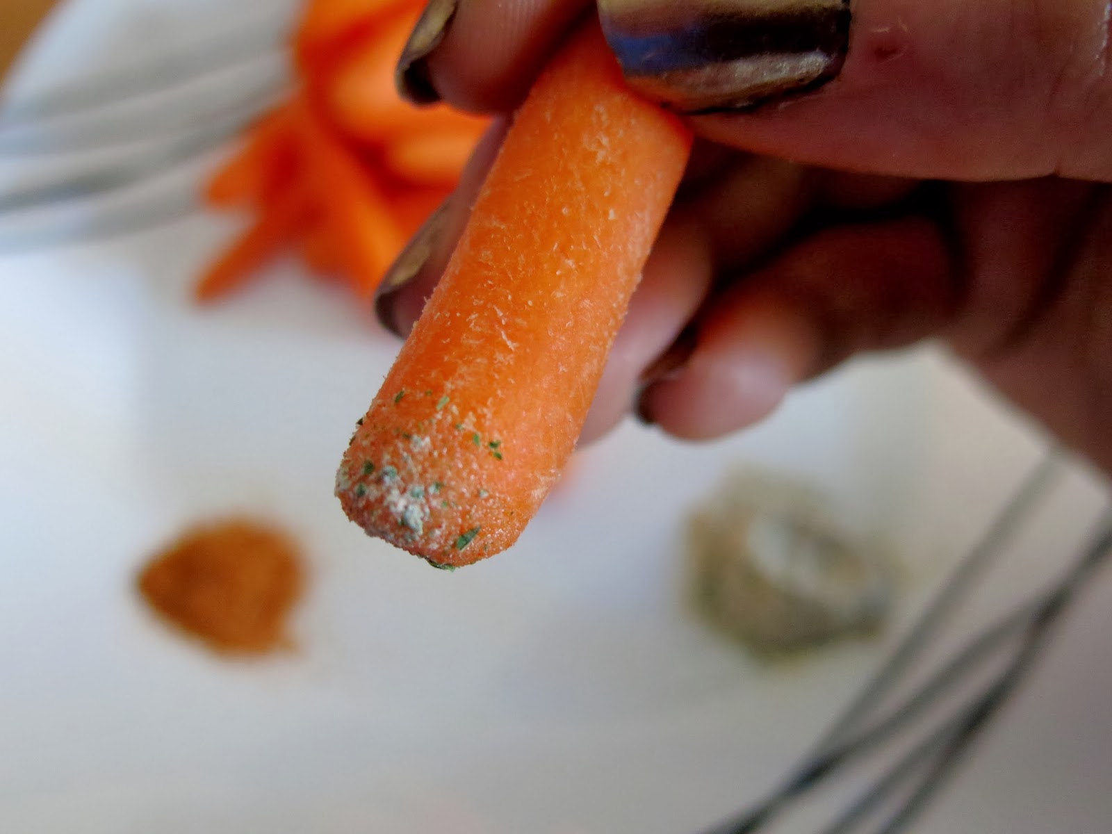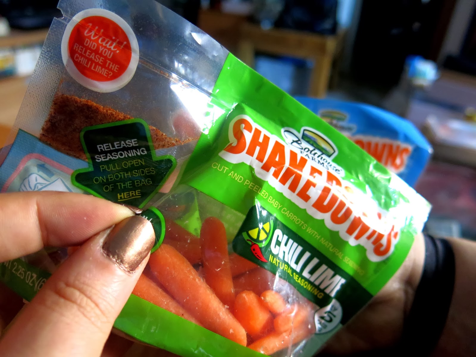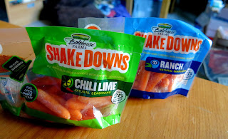 The packaging on the Shakedown packets is quite clever, with the seasonings stored in one corner of the bag until the snacker should pull the bag apart, thus releasing the seasoning into the carrots. This is where the name comes into play because after the seasonings have been released, one is to shake the bag vigorously, thus distributing the seasoning onto the carrots, which are then ready for snacking.