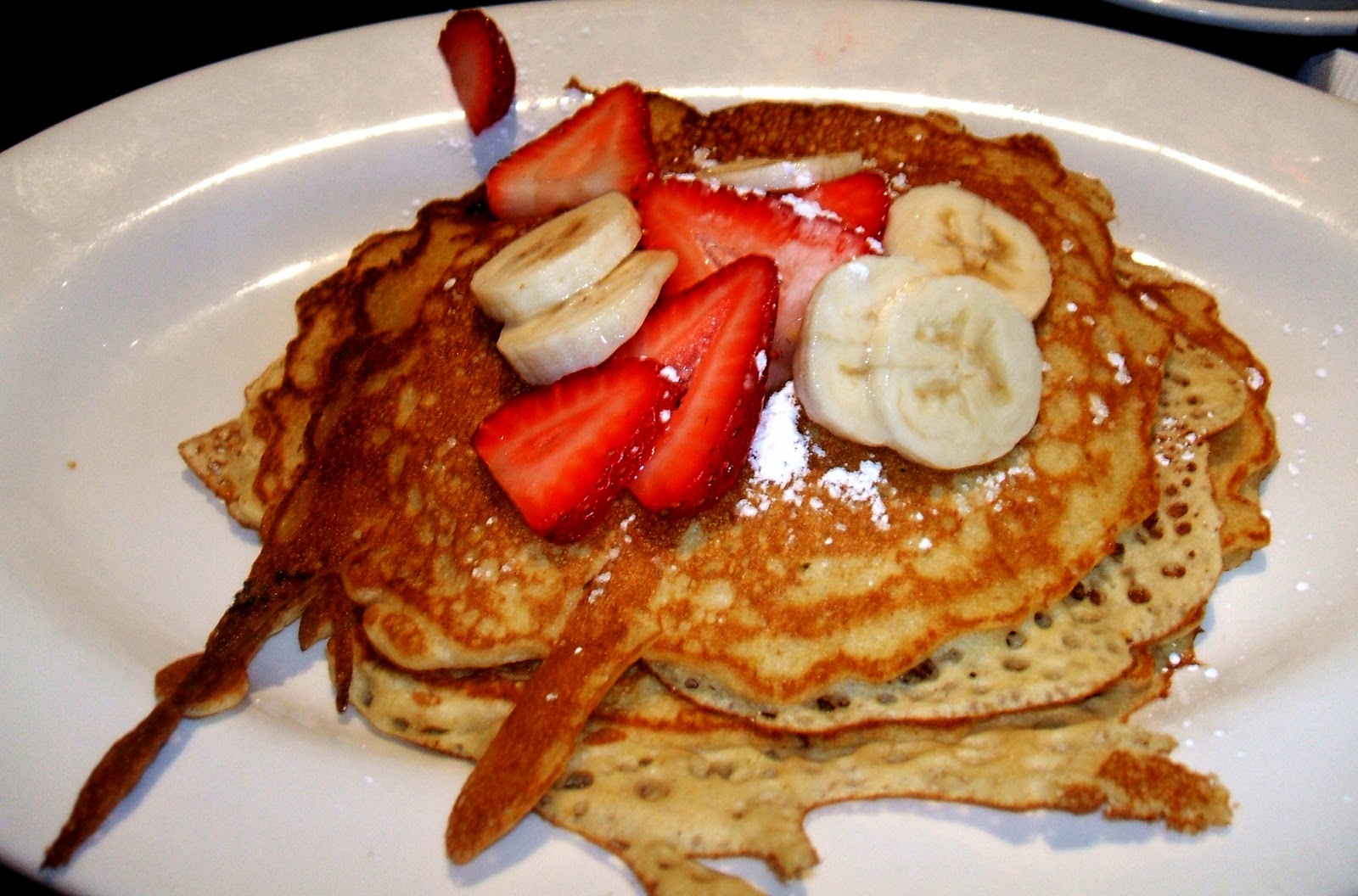 Brandy played things a bit safe with the Breakfast Torta (a steak and egg filed sandwich) and a short stack of pancakes. The sandwich, though filed with the hearty flavors of the tender steak as well as a spread of beans and sprinkle of Chihuauaha Cheese, was in desperate need of a little burst and crunch that could have easily been provided with a little tomato or onion. But Brandy did enjoy the softly toasted bolilo roll, and once she had added some of the house made red sauce that had been brought to the table, that burst she was looking for was found. The sandwich also came served with some rather nicely flavored and and creamy diced potatoes, which lent a very familiar flavor that Brandy just couldn't quite put her finger on. The pancakes, though traditional, were made well; extremely soft and fluffy and served with fresh strawberries and bananas, the two cakes seemed to make a perfect side dish to share with the table.