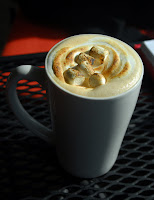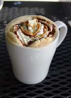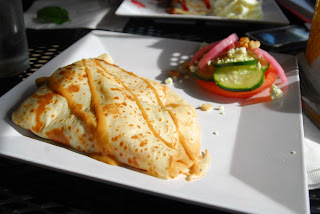 For starters, Brandy ordered the Baked Apple and Brie crepe, which came with a small fruit cup on the side. The crepe itself was light and thin as a good crepe should be, but not without flavor. As the open kitchen enables everyone to witness the crepes being made, their freshness was assured. The filling for this particular crepe was very rich, but well balanced. The brie was melted completely, taking away any of the bitterness that fresh brie can sometimes harbor, and leaving only sweet creaminess. The apples were diced and dotted throughout the interior of the crepe. Brandy had worried the filling might have been too sweet, but there was also wilted spinach and walnuts inside to make it a truly savory dish. Brandy's only complaint, in fact was that she would have preferred a small spinach salad on the side as apposed to the fruit cup, just to heighten the savoriness of the dish even more.