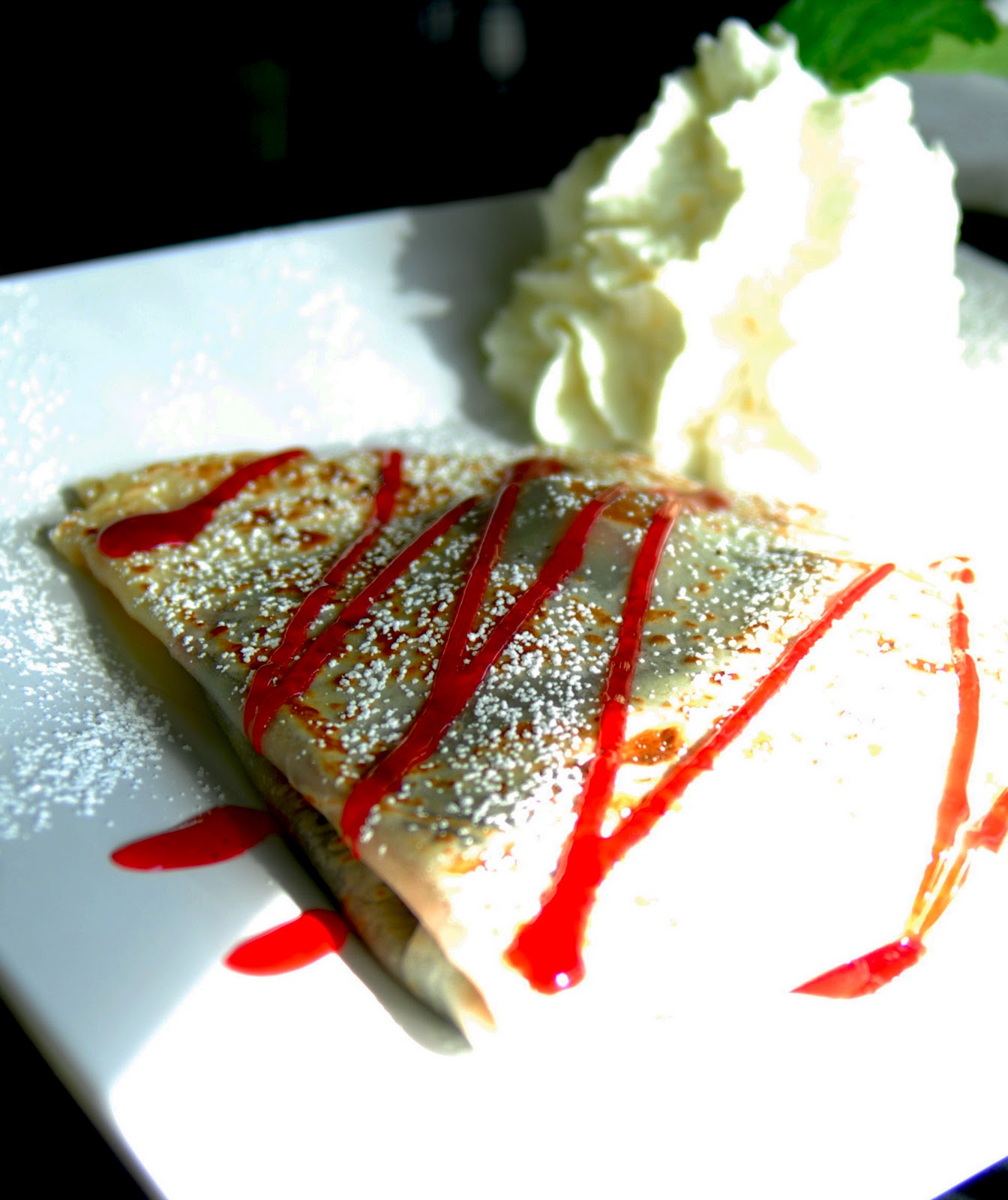Brandy, whose mother used to like to say she had a hollow leg, ordered dessert, which came in the form of a Dark Chocolate and Raspberry Crepe. Served enticingly with a large mound of whipped cream, the crepe was enough to take both of Our Ladies' breaths away. Brandy, ever the champion eater, had to pause between bites to savor the richness of the chocolate within, as well as the fresh raspberries hidden throughout like jewels in a dark treasure chest. A sublime ending to a wonderful meal.