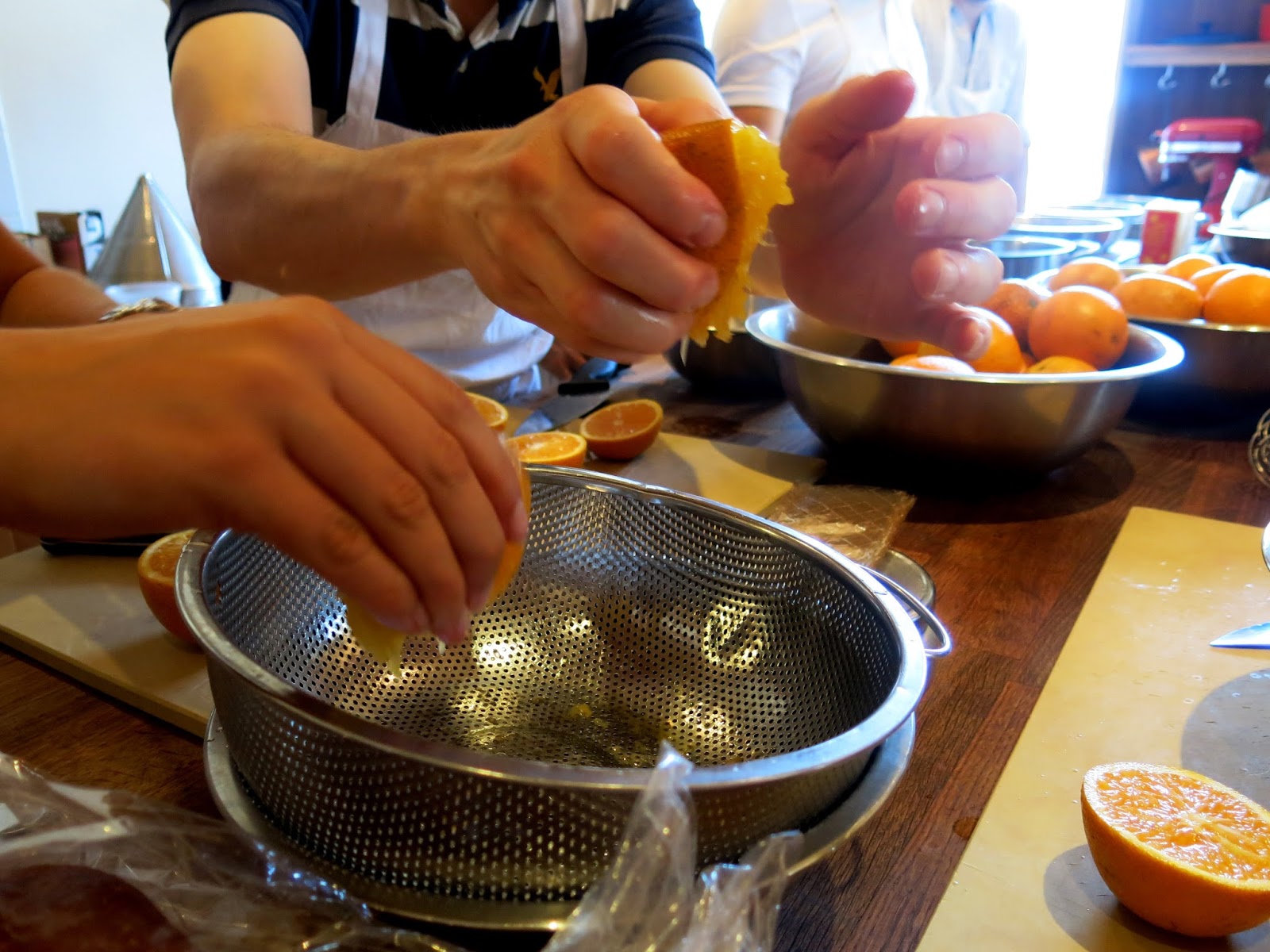 The morning began with the group all pitching in to squeeze some fresh orange juice. "If you don't want to do much today, you can do this," Chef Vincent told the group. This turned out to be a great way for the class to get to know one another, as they all gathered to slice citrus and pulverize pulp. Chef Vincent then started to divvy up the tasks among them, allowing the three courses of the meal to slowly come together.