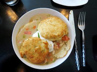 Brandy had decided on the Lobster Biscuits and Gravy as her entree. The dish certainly put the emphasis on the biscuits, as the two gigantic buttermilk biscuits, which had been cut in half so as to look more like four biscuits, dominated the plate. While the texture on the biscuits was beautifully tender, their flavor was more than a little on the salty side. The gravy, which was more of a brown gravy than the traditional cream gravy one normally sees on such a dish, wasn't as rich as Brandy would have liked, but the veggies in it added a much needed bit of texture to the dish. There was a decent amount of lobster mixed in, but it seemed over shadowed by the biscuits, and Brandy would have liked to have seen two poached eggs instead of one, if only for symmetry's sake. "It's not disappointing, per say, but I would have liked to see the lobster be a bit more extroverted here, It should be the star here, when really it's merely making a cameo appearance," Brandy commented, hunting under her biscuits for more little morsels of shellfish.