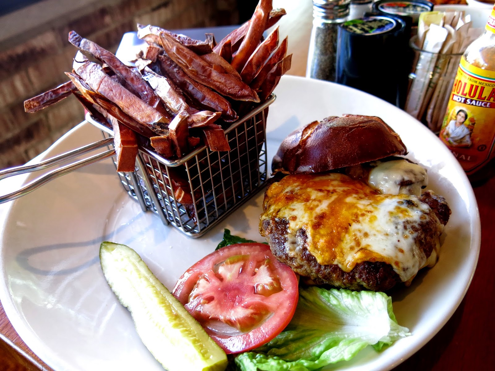 Next up Brandy ordered the Bridgeport Burger, which coincidentally had the same flavor profile as the burrito she had ordered the first time around (Hashbrowns offers omelets, burritos, and burgers in signature flavor combinations, all named after different Chicago neighborhoods). "The burrito was quite disappointing all those years ago, so this is a matter of redemption," she commented to no one in particular. The burger, made from premium New York strip, came simply dressed with some melted cheddar and mozzarella cheese on a pretzel bun and a few of the usual veggie accompaniments. Though a little dry, the burger packed a great punch of meaty flavor, something that can often be taken for granted. "I do enjoy a burger that actually tastes of meat," Brandy contemplated, "And its rather refreshing to have one that's not been dowsed in sauces and toppings to disguise it. Simple, clean, and flavorful. That is definitely comfort food in my book." The burger also came with a generous side of hand cut sweet potato fries. Those too had a nice clean flavor to them, and though not as crispy as Brandy might have liked, she still appreciated the attention to detail put into them, right down to the sea salt on top and the adorable basket they came served in.