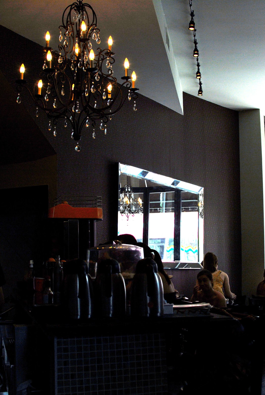 Last but not least was Brandy, who ordered the Bacon Waffle, a confection sounding too good to be true. Waffles made with bits of bacon in the batter were topped by chocolate covered pieces of bacon and bourbon caramel sauce. Their delightfully energetic server came over to apologize, saying he had mistakenly forgotten to put in the order, but within seconds of him leaving the table, the waffle was delivered. Though the waffle alone was not very remarkable, the rich, smokey chocolate bacon pieces made for a decadent treat, especially when dipped in the bourbon caramel. Again a little short on portion size (especially when compared to the rest of the entrees), but this time it made sense, for the richness of such a dish is probably best if limited.