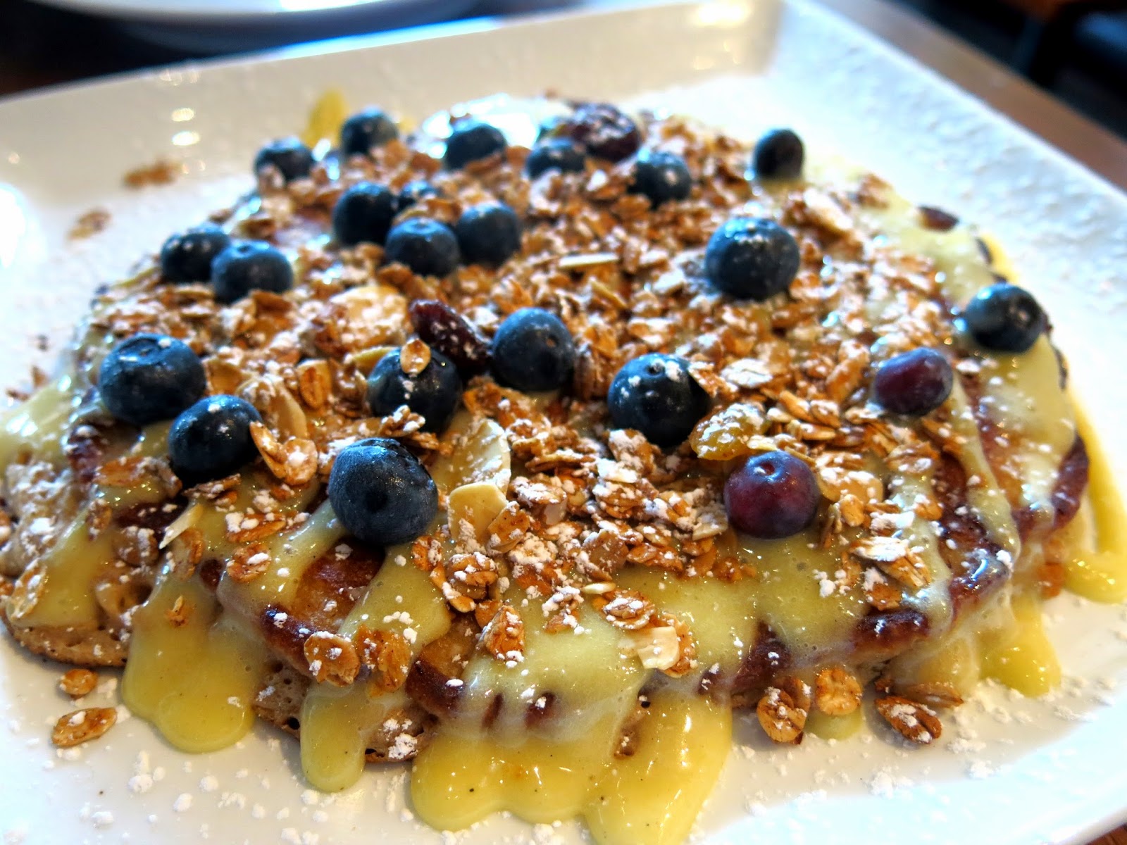The Scooby Snack was the next dish to the table, and the mere sight of it had Brandy swooning with delight. The plate was a mile high stack of chocolate chip pancakes smothered in fudge sauce and topped with graham cracker pieces and a toasted marshmallow fluff. Not entirely understanding the cultural reference of the dish's name, the waitress kindly directed Brandy's attention to the classic cartoons playing on the televisions above the kitchen. "But you couldn't give these pancakes to a dog!" Brandy exclaimed in horror, "They're not supposed to have chocolate!" As expected, the dish was decadent and rich, though the pancakes were actual quite light in texture. The glistening chocolate sauce had been finished with just a little hit of salt, which really elevated what could have been a tooth achingly sweet dish, and the bits of graham cracker kept everything lively with a bit of crunch.