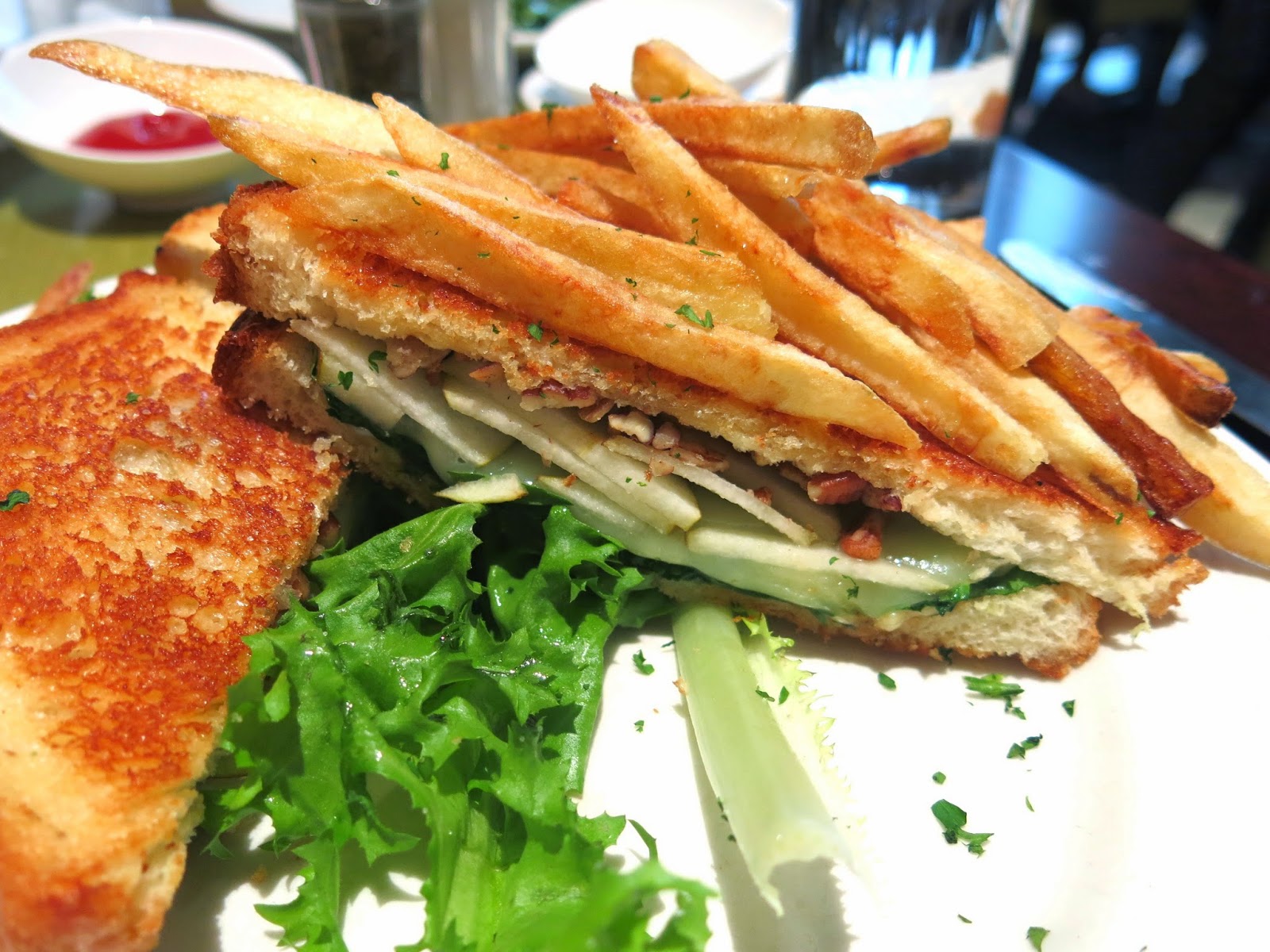 For her main course, Brandy ordered one of the restaurant's signature grilled cheese sandwiches. The one she chose had sliced pear, fresh mozzarella, spinach, fig jam, candied pecans, and Roquefort cheese and came with a side of French fries. The fries had a very nice flavor, though their texture was rather inconsistent, with some being utterly limp and others being so crispy they cut the roof of her mouth. As for the sandwich, while Brandy did like the flavors, she found it had gone extremely soggy on the bottom, making it rather difficult to hold onto. She did, however, very much enjoy the sweet and savory balance from the fruit and the cheeses as well and the little bit of crunch from the nuts. "Granted, this combination of ingredients is a little on the wet side, but the whole point of a grilled cheese sandwich is that the crusty bread contains the innards," Brandy said, studying the floppy sandwich in her hand, "Perhaps this would do better open faced on a sturdier piece of bread." She was also rather disappointed by the lack of interest in plating her meal, which resulted in two limp leaves of lettuce laid pointlessly on her plate, one of which was nothing more than a bare rib sticking out from underneath her sandwich. "Why even bother to put it there?" she wondered aloud, "One might as well dress the plate with onion skins and tomato tops!"