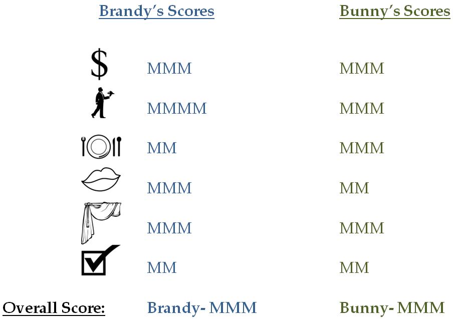 Bottom Dishes: Bailey and Bunny reported the pancakes to be extremely dry, even after being covered in syrup, whipped cream, and strawberries. In fact, during the entire time Our Ladies and guest were seated, the pancakes were never once replaced or replenished. Also the potatoes, according to Brandy, were rather limp, greasy, and flavorless, though Bailey did enjoy them, so perhaps that old adage about great minds thinking alike does not always apply.