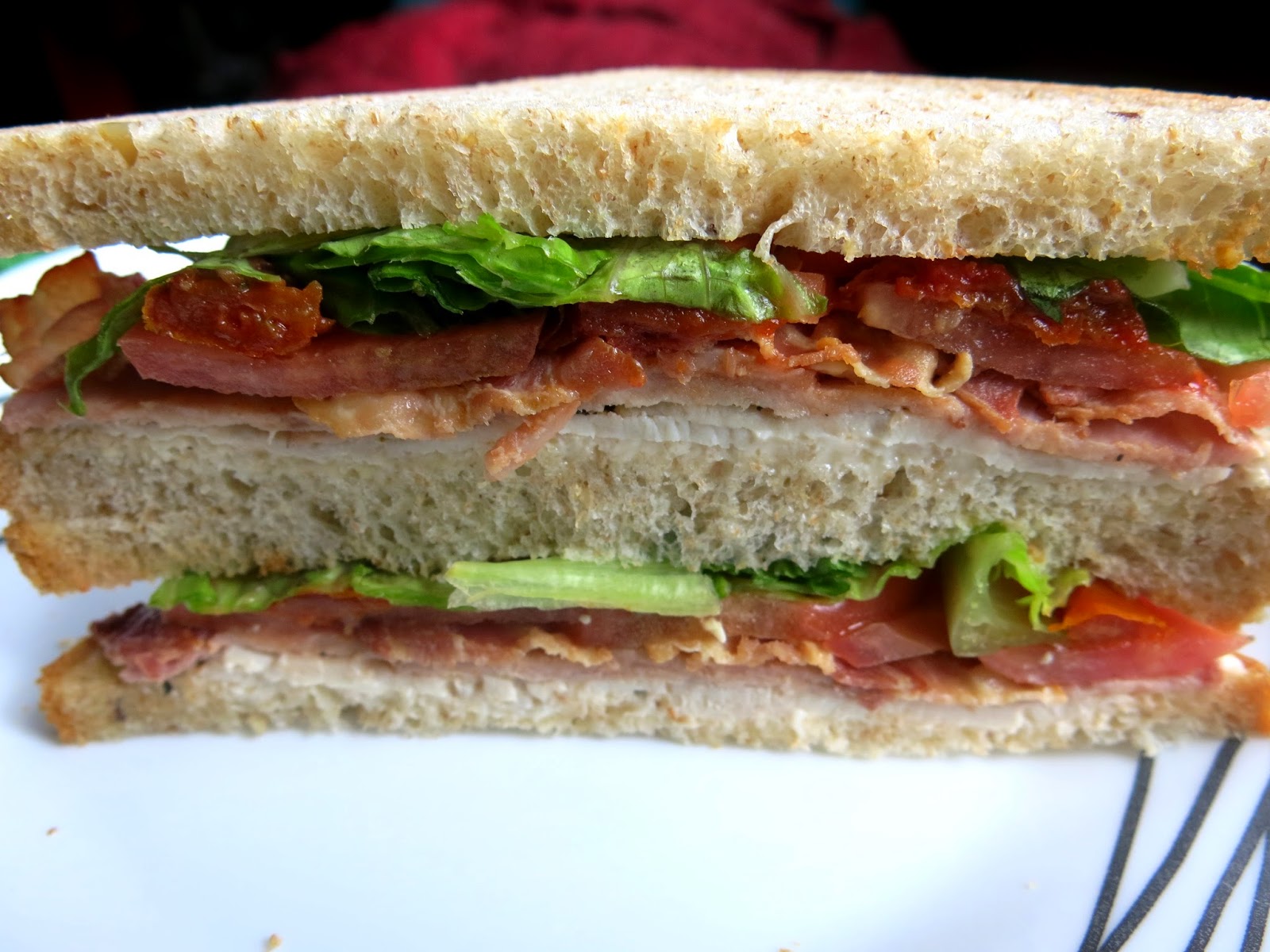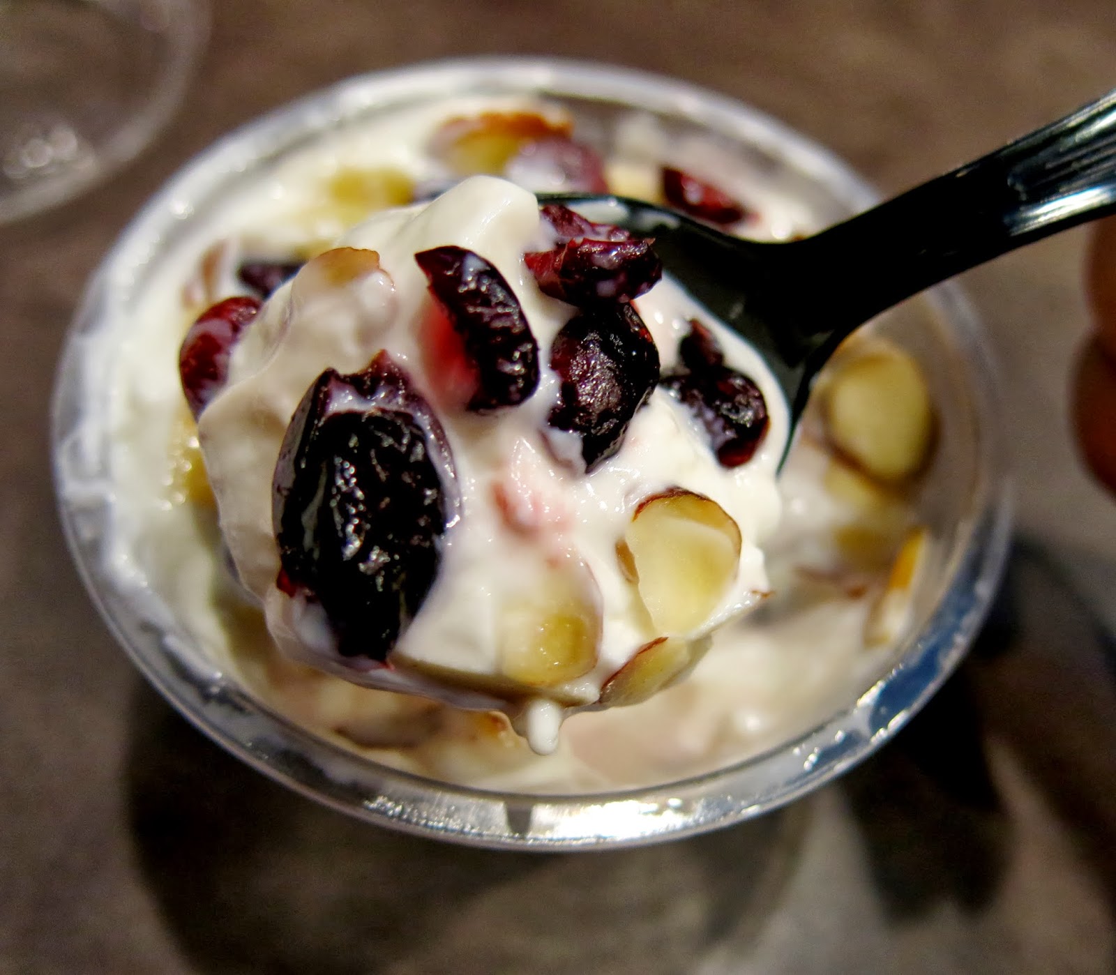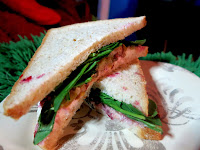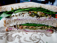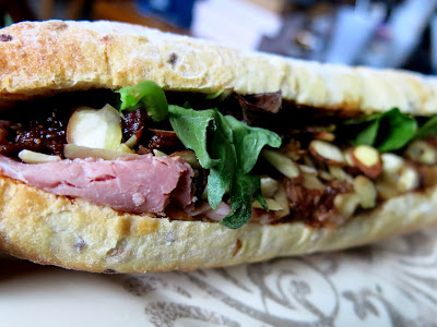 There were three sandwiches to choose from: the Holiday Lunch, the Holiday Cranberry and Goat Cheese, and the Holiday Ham and Fig Chutney. The Holiday Lunch consisted of a mix of traditional Thanksgiving flavors with moist slices of turkey, a crunchy nut roast stuffing, cranberry sauce, and spinach on soft granary bread. Brandy really loved the mix of flavors and textures in this sandwich and especially that the turkey remained the star of the show. The Holiday Cranberry and Goat Cheese turned out to be a vegetarian version of the Holiday Lunch with smooth, creamy goat cheese spread replacing the turkey. Brandy felt that the cranberry was given more room to shine in this sandwich. The Holiday Ham and Fig, which came served on a hearty baguette, provided a more Christmasy contrast with a smokey, tender ham, sweet fig chutney, and crunchy almonds.