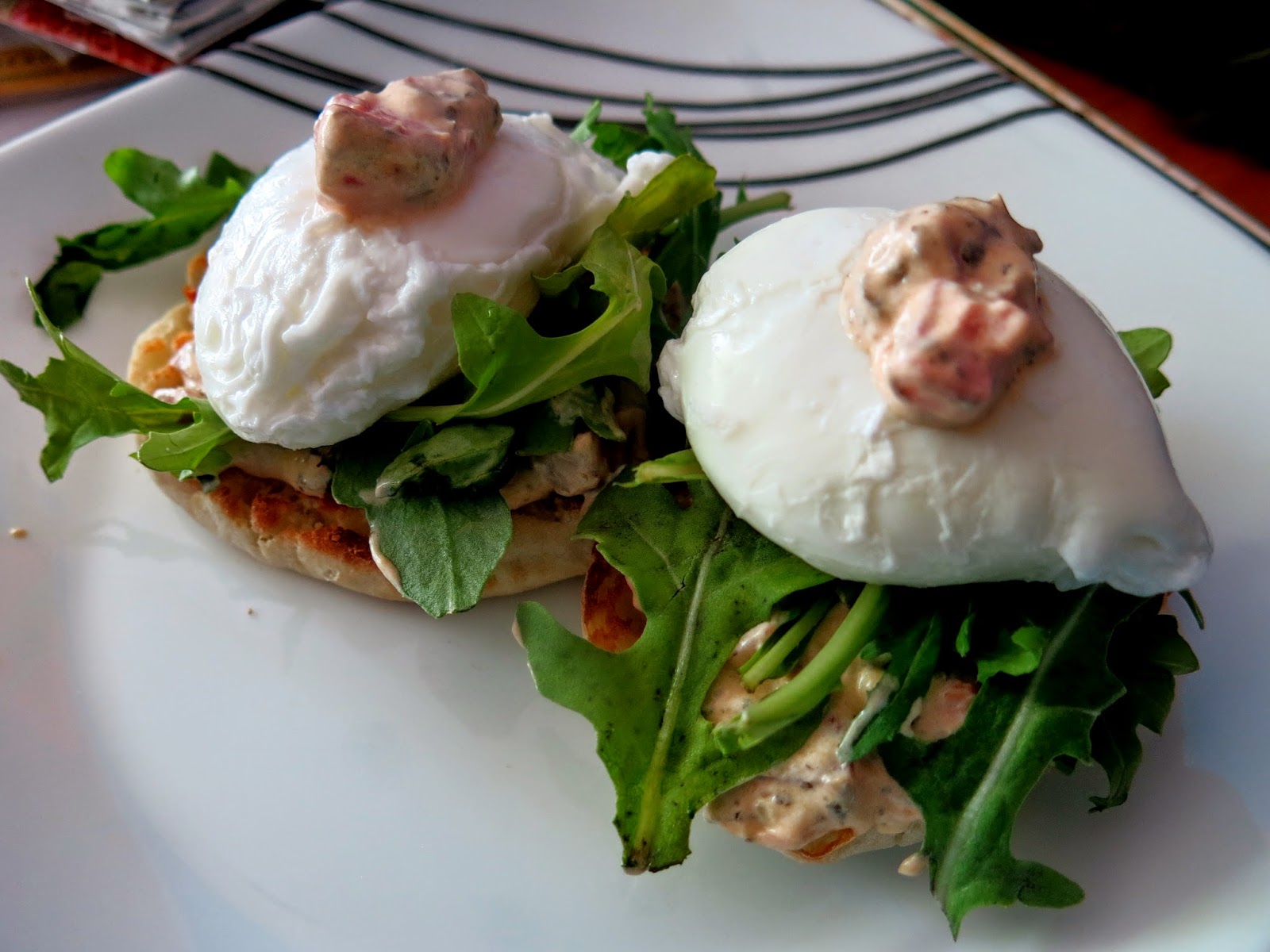 Place English muffin halves on a plate and add about a tablespoon of aioli to each half, then add some of the greens, then the eggs, and finally top with just a little bit of aioli. Serve immediately.