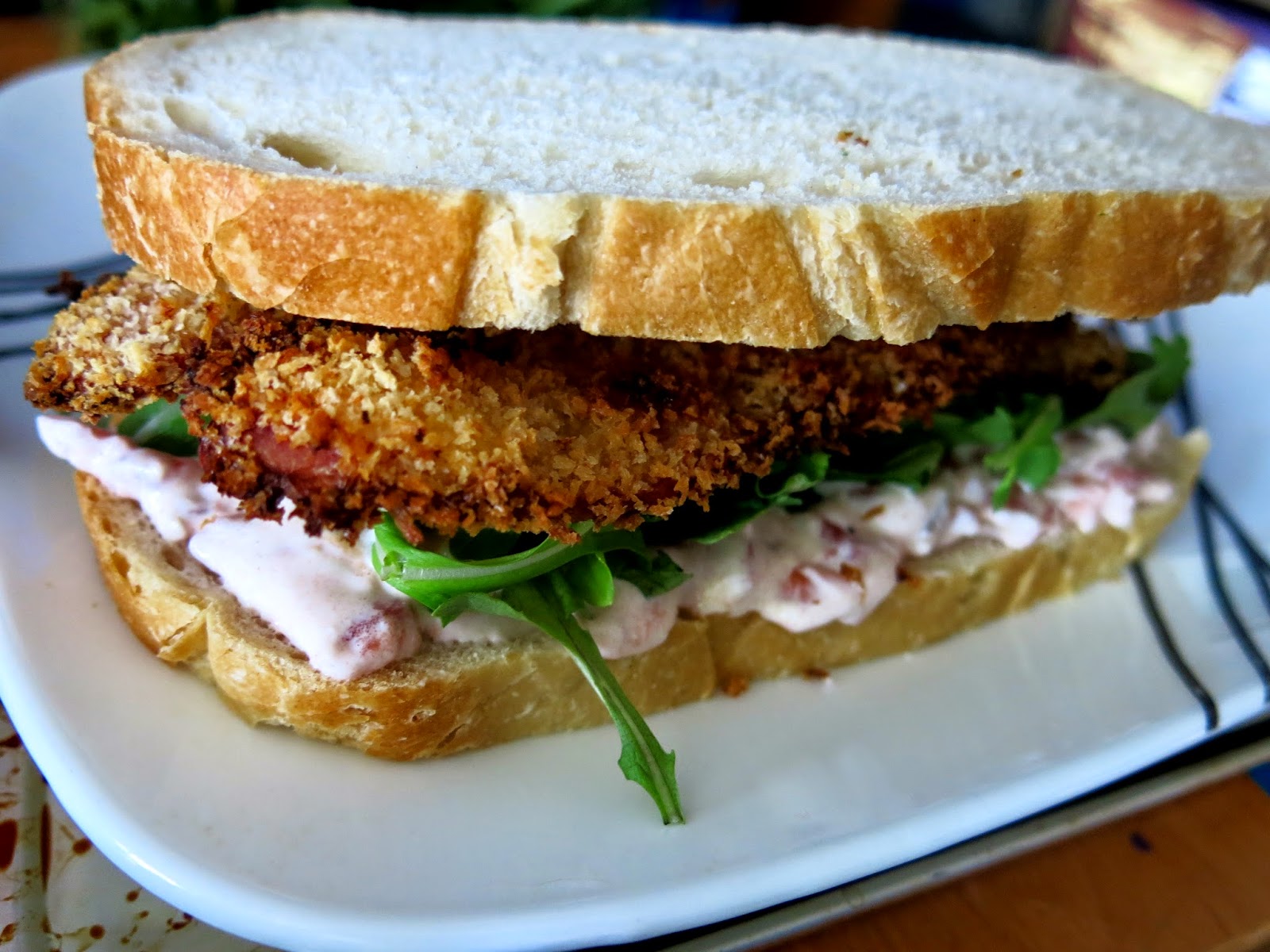 On a thick slice of sourdough bread, spread a generous layer of the tomato aioli, then top with your favorite greens (Bunny suggests a peppery arugula to counter act the saltiness of the bacon), 3 strips of the breaded bacon, add a little more aioli just to hold the sandwich together, and place the final piece of bread on top.