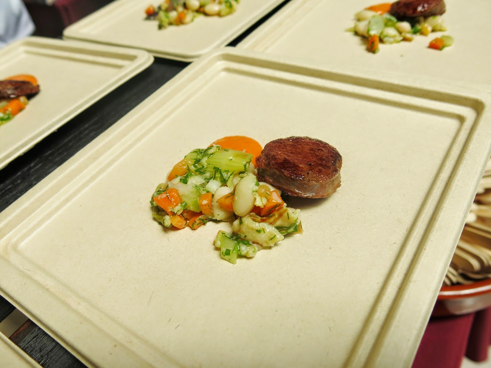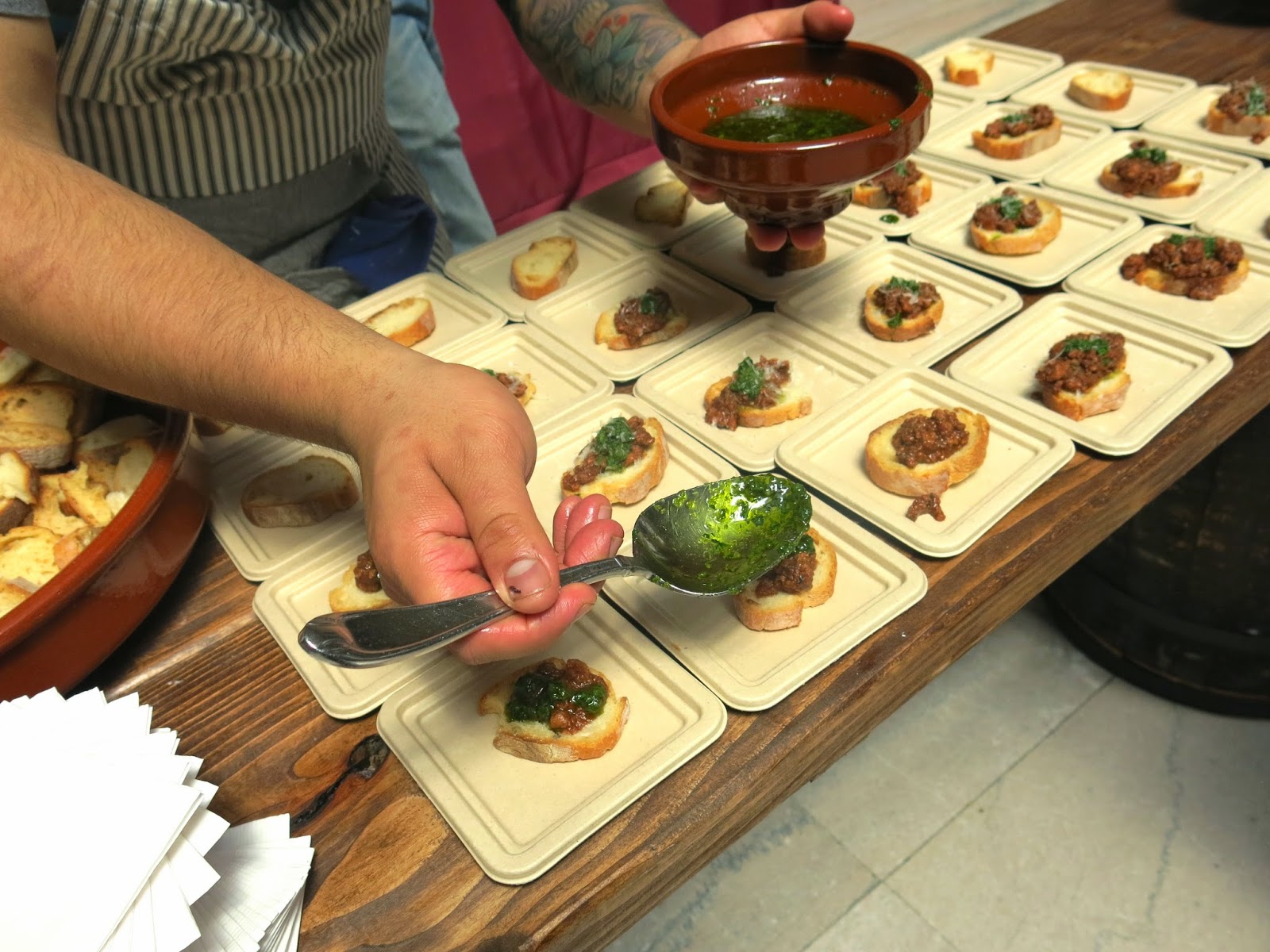 The day focused around different preparations at the center island, which included a huge collaborative starchy vegetable dish, which was laid out on a length of table, then scooped up and served with flat bread.  The main event, however, was the chefs carving up whole roasted animals, serving everything from the loin to the shoulder to the cheeks, which was definitely not a sight for the faint of heart (or squeamish vegetarians for that matter).