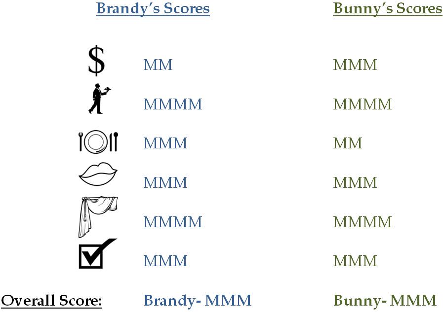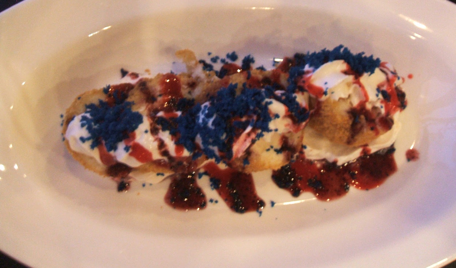 Lastly, the group was presented with dessert, Tempura Ice Cream. The sight of the dish brought a little patriotic tear to Hawke's eye, as it was topped with a bright red strawberry sauce and more of the "blue crunch." "All it needs is a few sparklers," Brandy smirked. Inside the crispy coating was a smooth vanilla ice cream and a little pound cake, which made for a slightly grainy texture, but the dish was so fun that no one seemed to mind, and the plate was soon scraped clean.