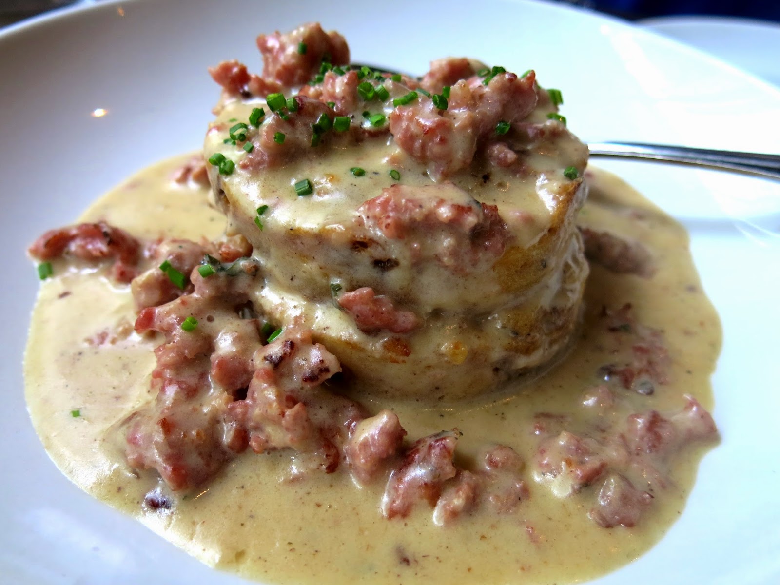 Next, they sampled the Biscuits and Gravy. This was no average biscuits and gravy, but rather two perfect rounds of smoked brioche bread pudding slathered in a prosciutto and mushroom gravy with a little bit of truffle oil. Once again, the plating of the dish simply dazzled Brandy. "It's extremely hard to make biscuits and gravy look pretty," Brandy remarked, "But look at this thing! It's a bloody masterpiece!" The dense rounds of bread pudding had an almost cheesy flavor with a slight hint of aromatic sweetness, working surprisingly well with the savory gravy, which was loaded with chunks of tender, melt in your mouth pork sausage.