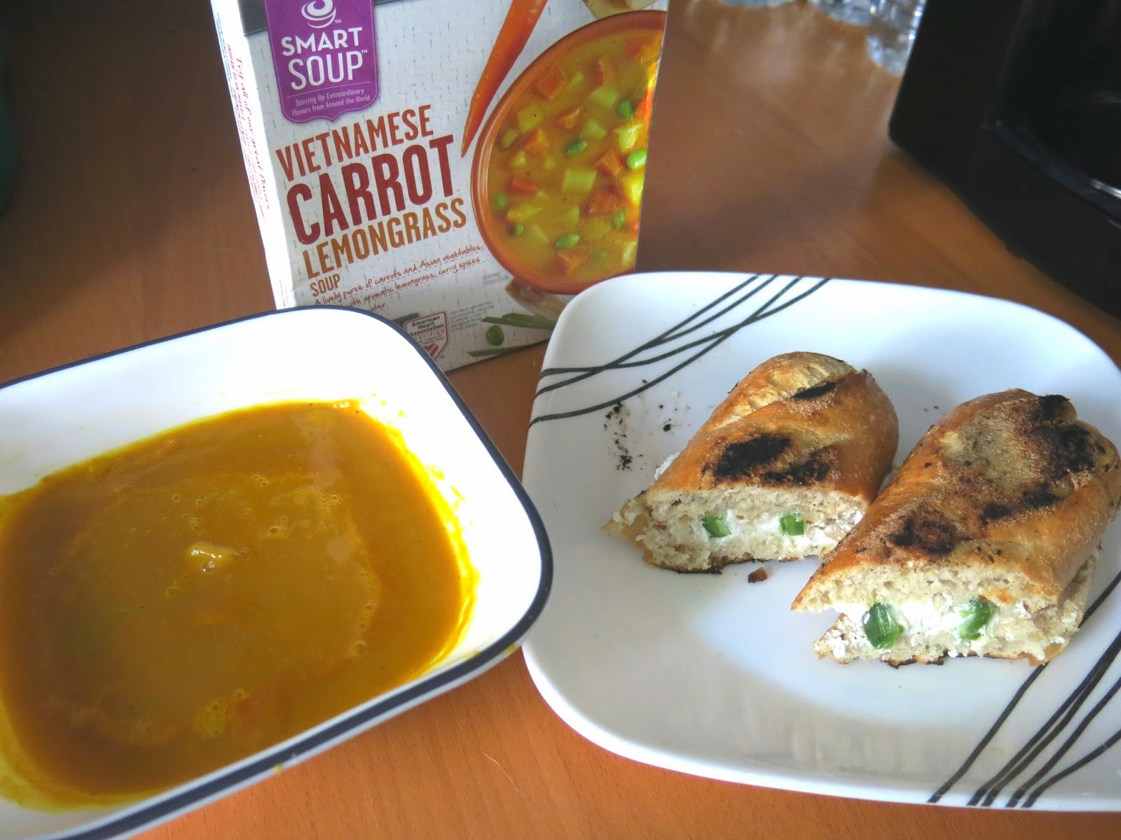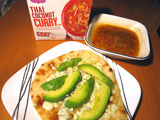 As this soup had a sweet, spicy, and slightly sour base, Brandy thought a creamy and pungent cheese would go best, so she spread some blue cheese on a chewy naan bread, placed the creation under the broiler for just a bit, and topped it off with some fresh avocado. The combination of this open faced sandwich with the spicy soup was so good that Brandy actually ended up spooning the soup on top of the bread as well to create the ultimate international flat bread pizza.