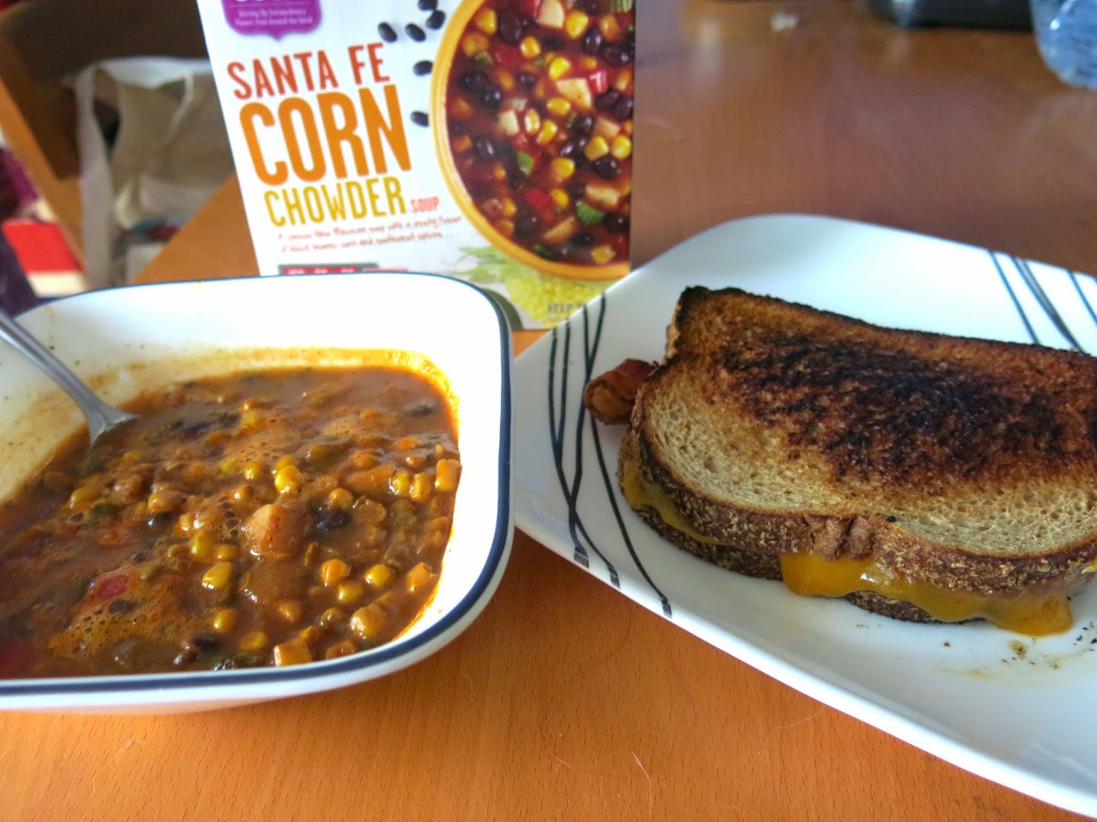 For this South Western inspired soup, Brandy went all American and used some sharp cheddar and crisp bacon on whole wheat bread. As this was one of the lightest of the soups, Brandy thought the rich cheddar and fatty bacon worked perfectly with the sweet corn and savory black beans.
