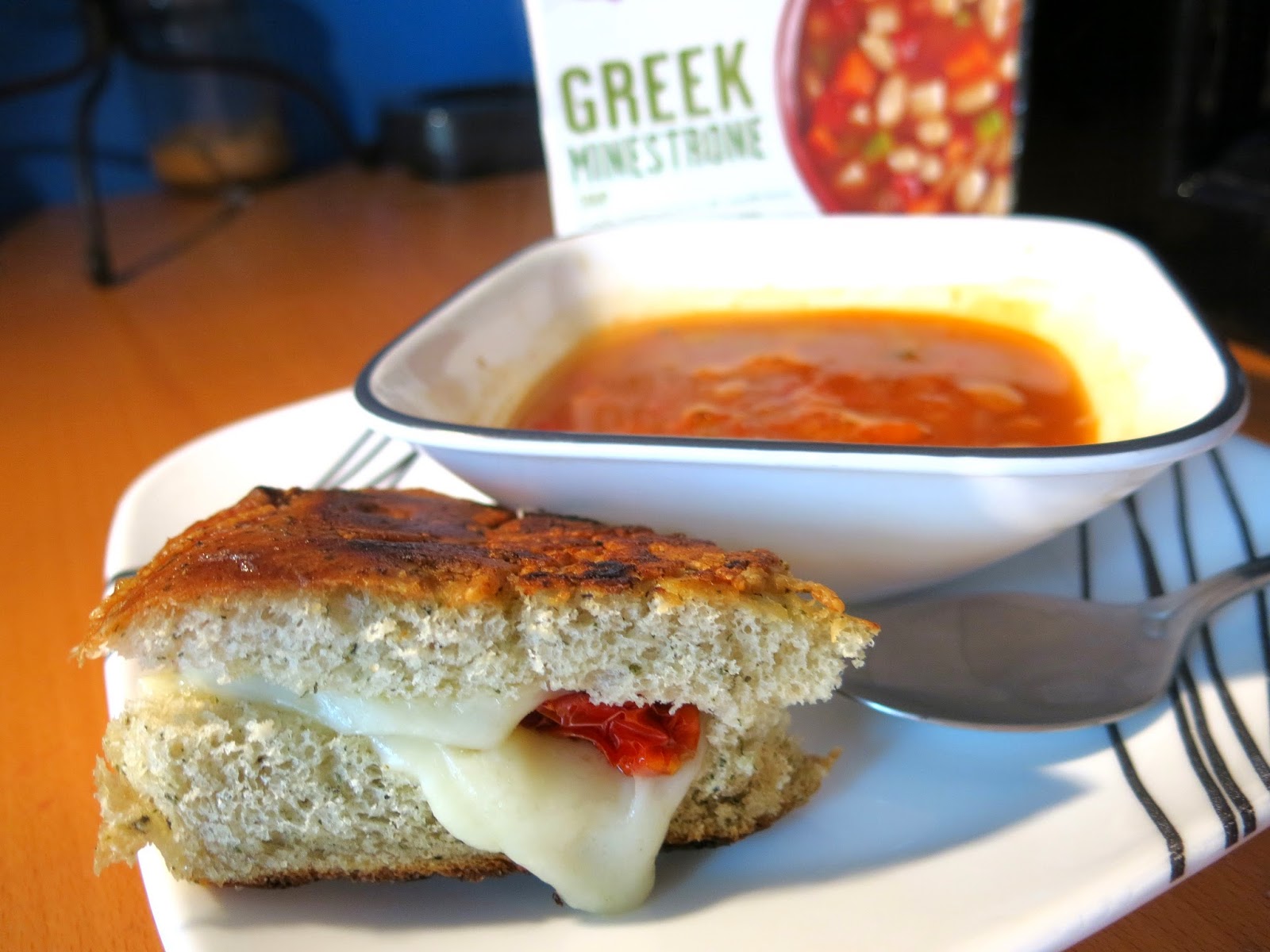 For this soup, Brandy suggests an Italian inspired grilled cheese with whole milk mozzarella and sun-dried tomato on focaccia bread. The rich cheese and sweet sun-dreid tomato help to balance out the bold tomato broth of the soup, while the hearty focaccia bread is perfect for scooping up all those chunky veggies.