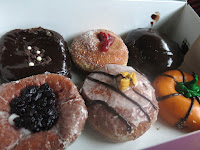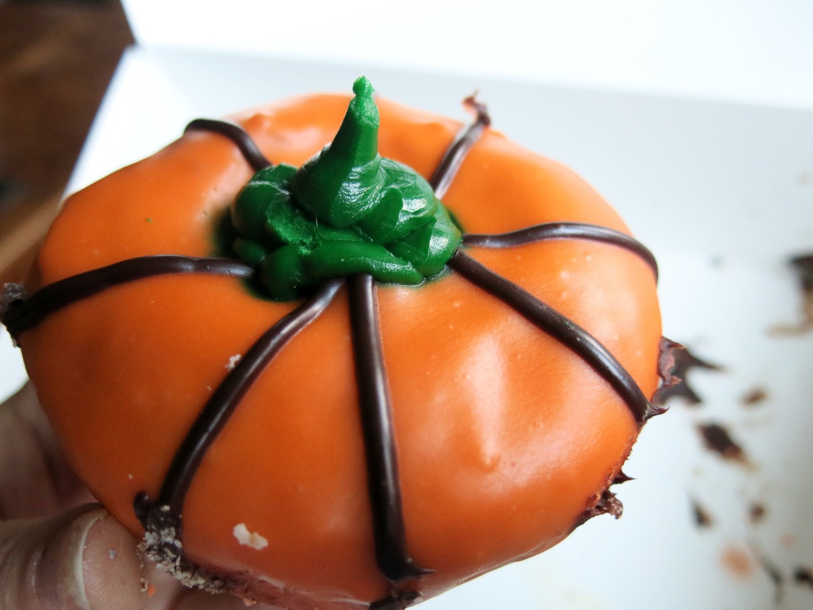 Lastly was the adorable Pumpkin donut. Despite its appearance, Brandy was saddened to discover that the donut was in fact a simple vanilla cake donut rather than a pumpkin flavored one. Regardless, the sugary decoration was enough to merit its existence, and the flavor was actually enhanced a little by the chocolate sauce that had been used to create the pumpkin. The texture of the cake donut wasn't overly dense and would have been perfect with a cup of coffee (or dare we say a pumpkin latte?) to accompany it.