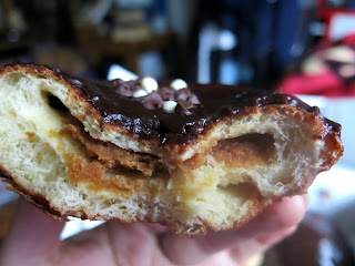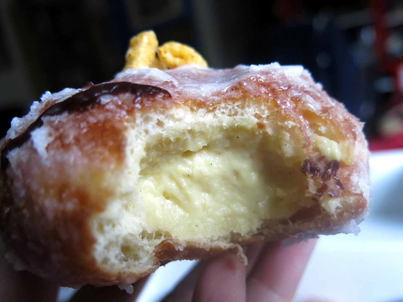 Next Brandy went for the Captain Crunch donut. Regardless of not having grown up with the infamous Capt'n, Brandy was rather interested to try this one if only because of its uniqueness, but the flavor turned out to be a little disappointing. The inside seemed to be a simple, yet delicious pastry cream with lots of vanilla flavor, meaning the only thing that differentiated this donut was the two pieces of crunch cereal embedded into the glaze on top.