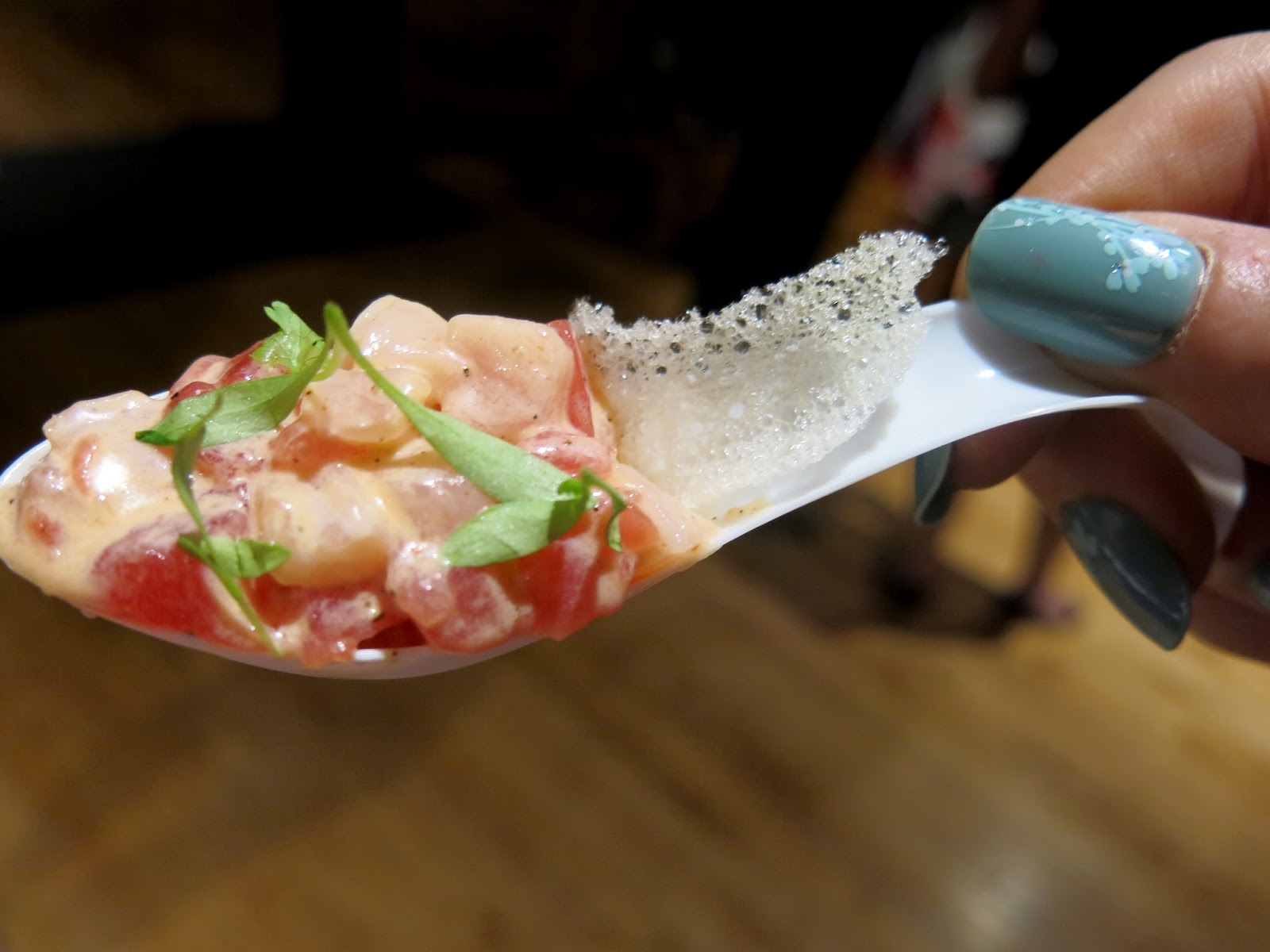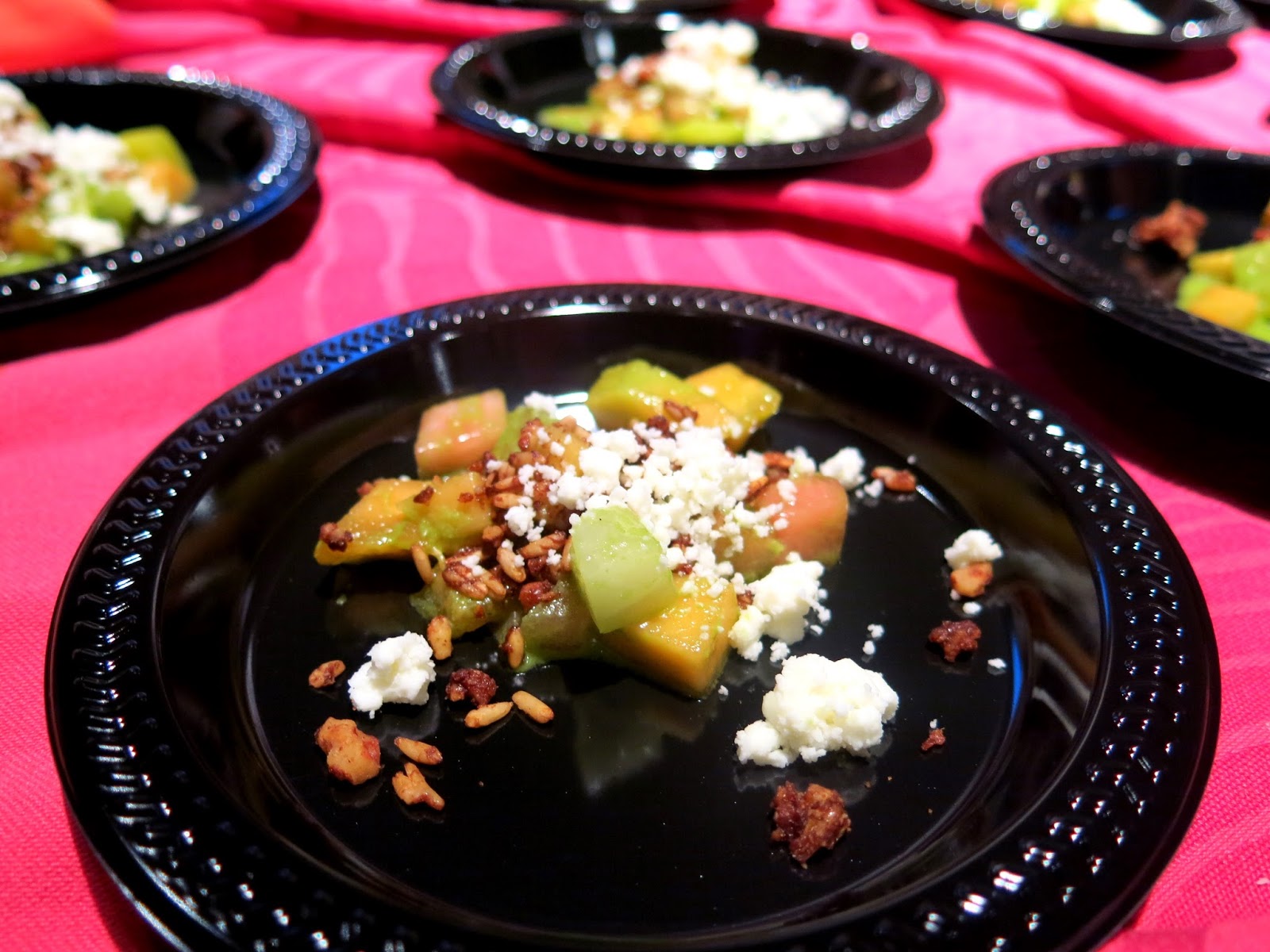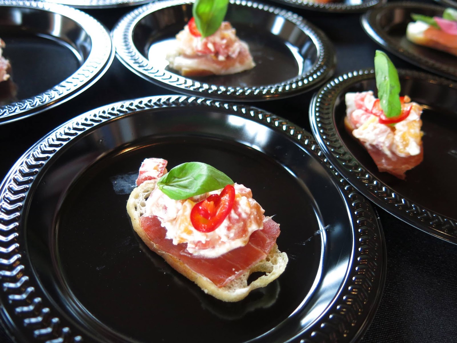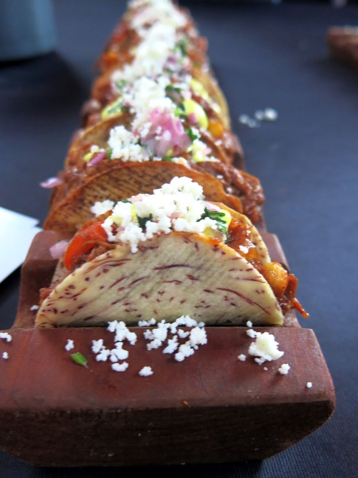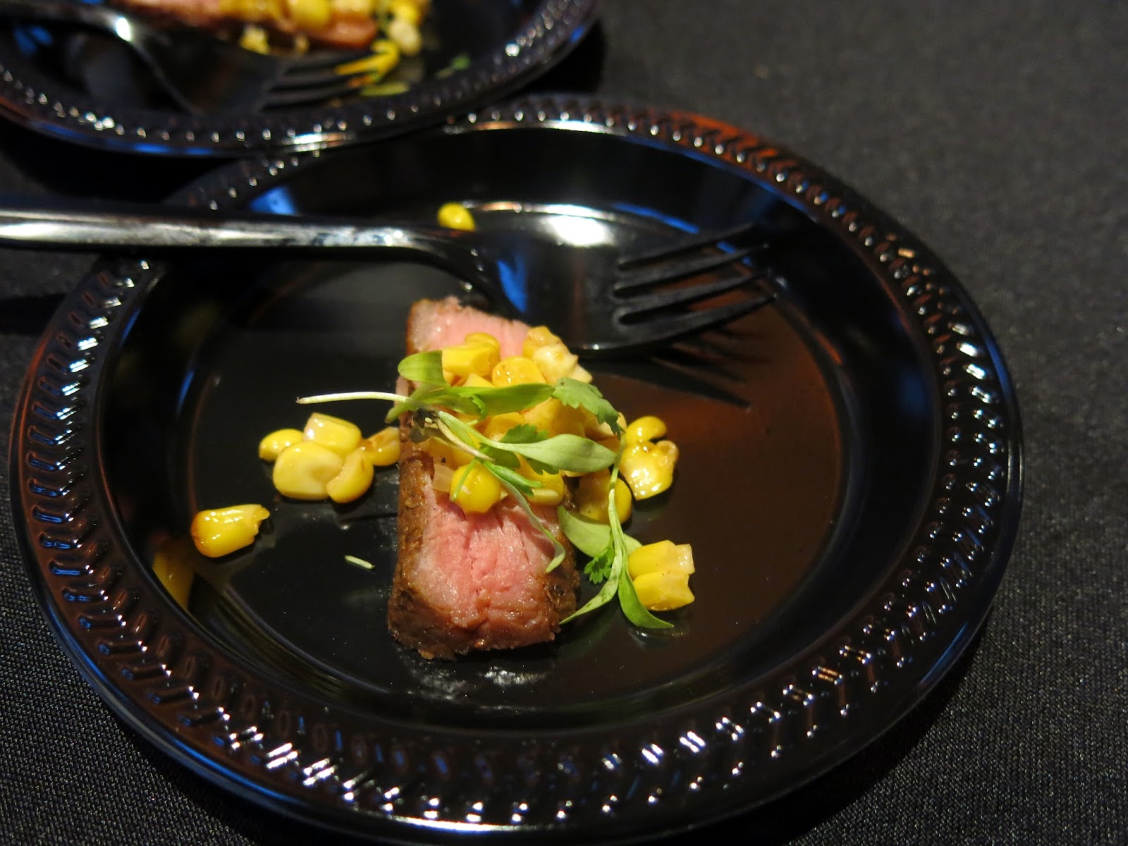 Bunny, anxious to get started, jumped right into the food.  Meats and toasts seemed to be a theme of the evening with several restaurants serving up carnivorous and carb loaded bites.  The Radler brought forth a sweet and savory Summer Sausage with one having plum mustard, endive, candied pecans, and black lemon, while Troquet offered two different "tartines" with white peach, heirloom tomato, chili, and prosciutto, which made for a fresh, summery bite, while the other one featured smoked salmon, cucumber, asparagus, cream cheese, and pickled radish, which reminded Bunny of a tea sandwich.  Eden had a different version of a smoked salmon toast, this one with pickled beet, radish, corn, red oinon, and Fresno chili and Eno presented a Country Ham on grilled caraway bread with pickled peaches and micro greens.  Breaking the mold a little with their offerings were Micheal Jordon's Steakhouse with a grilled Mesquite New York Strip and lobster creamed corn as well as Honey Butter Fried Chicken putting up a scrumptious Fried Chicken Nacho plate with pimento cheese, lime crema, and roasted corn pico de gallo,
