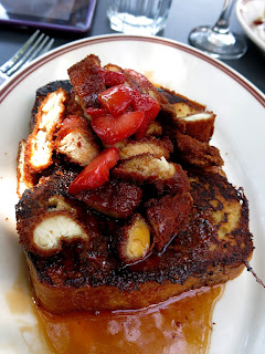 Brandy chose the Bullseye French Toast, a sort of hybrid of a chicken and waffle meets toad in the hole, made with a traditional egg battered bread that had a soft fried egg at its center. The bread itself (made in house at Little Goat's side bakery) was a sweet onion brioche, which made it a little more savory than any average French toast, and was helped along by a very sweet BBQ flavored maple syrup and tart, fresh strawberries. The chicken was cut in thick chunks and had a brilliant crunchy coating, though the meat was rather dry on the inside.