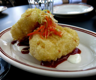 The Ladies split an order of the Tempura Mashed Potatoes as a starter, mostly just so that they could see what such a dish looked like. "I don't understand, do they mix the batter into the potatoes?" Bunny questioned, "Or perhaps they surround a crunchy fritter with the potatoes? I just can't picture it!" What came to the table more resembled crab cakes in that they were circular patties with a crunchy looking coating. Served along side the potatoes was a tangy Asian style BBQ sauce and a cooling ranch that both Bunny and Brandy thought made the otherwise subtly seasoned spuds come alive. The outside of the cakes were lightly crisp, but gave way easily to the butter soft taters within, making for an oddly familiar mix of textures that was still somehow wholly unique.