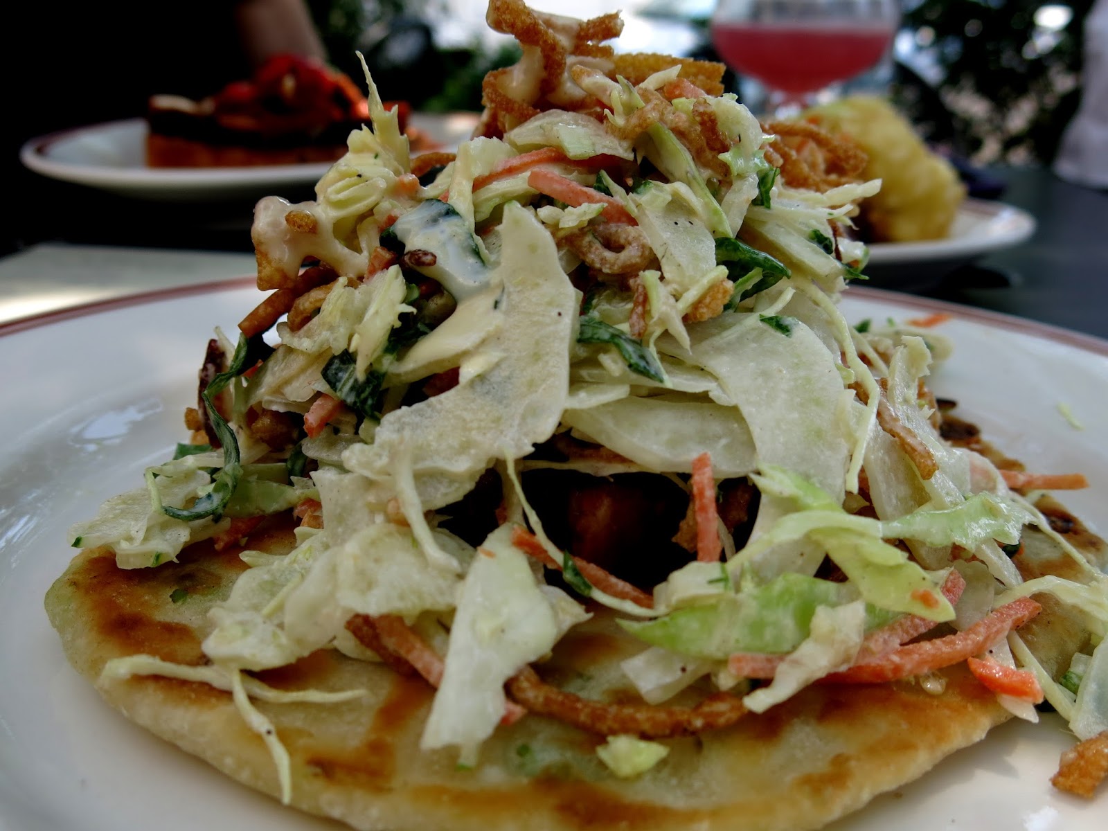 For her entree, Bunny chose the decadent sounding Porkbelly Pancakes. The dish was essentially a stack of savory pancakes flavored with green onions and topped with succulent pulled pork belly and a crunchy Asian slaw. Bunny found the pancakes to have a nice chewy texture which matched well with crunchy vegetation and soft, melt in your mouth meat. The only thingy Bunny longed for was a little more sourness from the dressing, which seemed a little on the bland side.