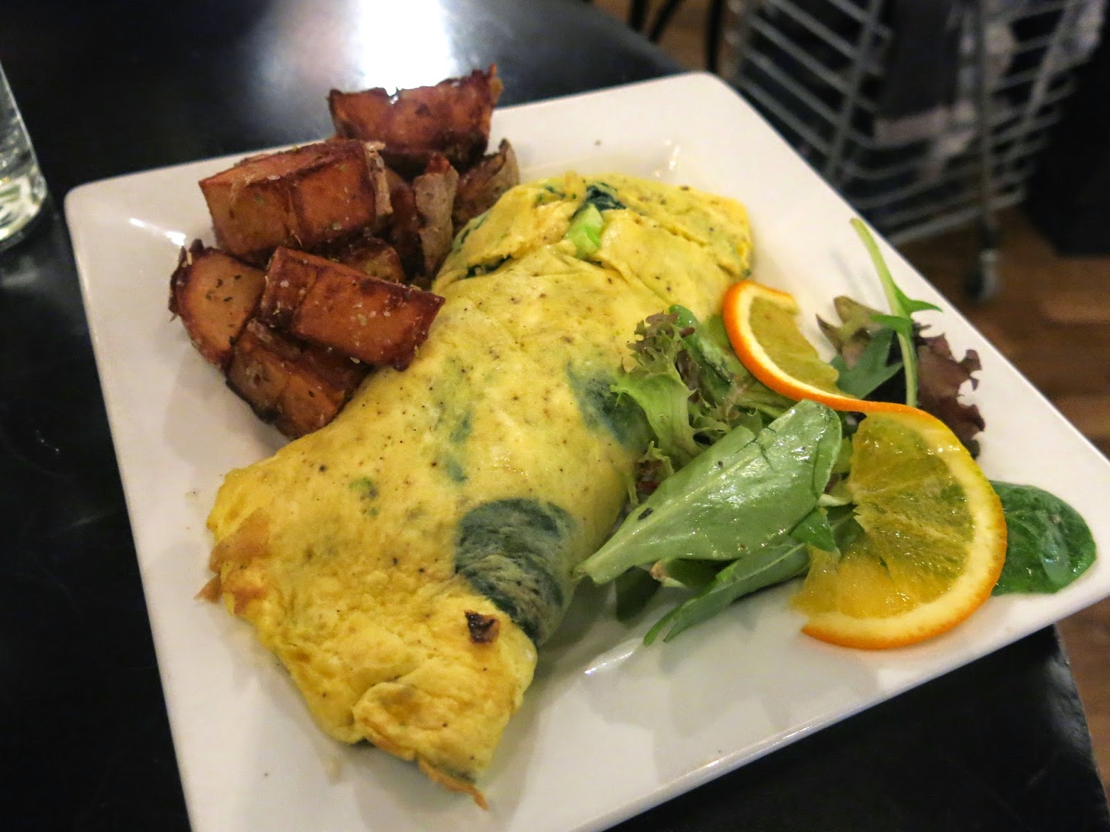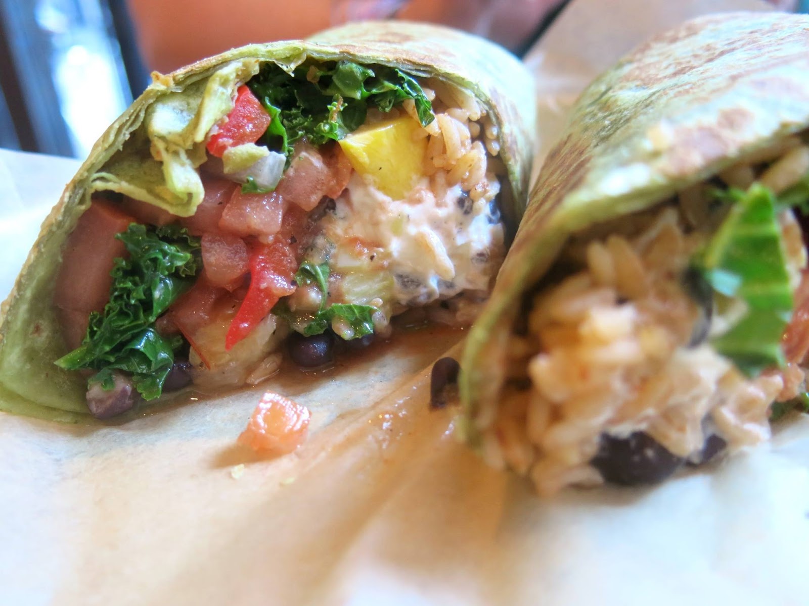 Moving on to some of the healthier options, Brandy sampled the Quinoa Salad. This was no typical salad filled with chopped carrots and tomatoes over a bed of lettuce, but rather a bowl full of fresh and sauted veggies like corn, beans, zucchini, peppers, onions, and avocado, all combined with a organic quinoa for a delightful mix of textures. "For such a healthy salad, I have to say that it's rather filing," Brandy commented. Also from the healthier and vegetarian side of the menu was the Goat Cheese and Black Bean burrito. Brandy found this burrito absolutely delicious with its mix of grilled veggies, creamy goat cheese, black beans, and wonderfully spiced red rice all wrapped up in a warm spinach tortilla. "I would have been happy with all the veggie in here," Brandy commented, "But that creamy core of goat cheese just puts it over the top. This is one of those vegetarian dishes that could please even the staunchest carnivore!"