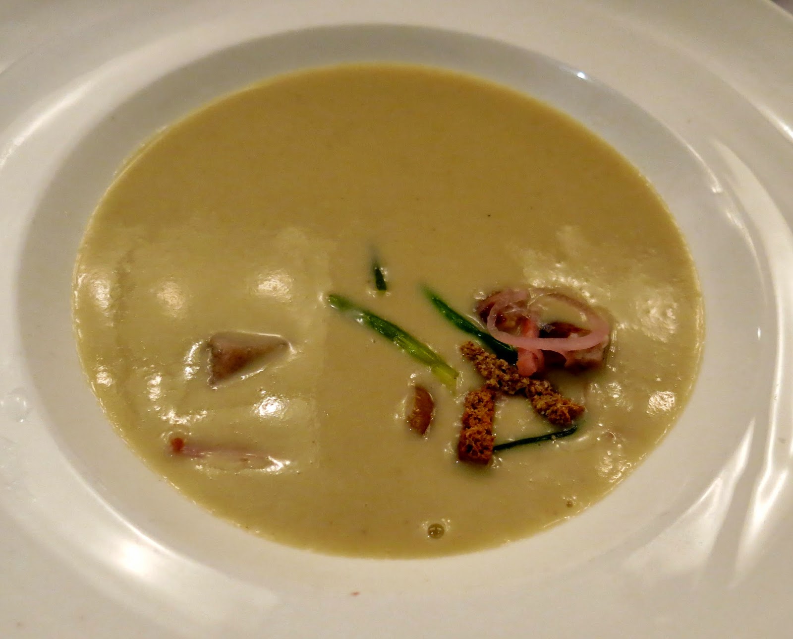 They then moved on to bowls of some Irish Potato-Ale Soup. The presentation for the soup could not have been more beautiful, with the liquid portion being poured tableside over a bowl of brown bread croutons, chunks of bacon, and pickled ramps. Though both Brandy and Bailey found the soup a little on the thin side, it did have a nice subtle flavor of beer, and the mix of textures in the garnishes truly made it something special.