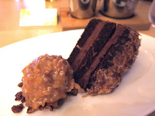 For the entree, Brandy picked the Casareccia Pasta and was instantly glad she had. Chef Tim Graham himself carted out a giant wheel of Parmesan cheese which he tossed the tube shaped pasta in along with a yellow tomato sauce and then topped the dish a generous helping of herbed ricotta. The bite on the hand rolled pasta was just perfectly al dente and the sauce had a lovely creamy mouth feel, no doubt from having been infused with the nutty cheese. The ricotta actually helped to lighten up the dish a bit, providing a bit of soft and fluffy texture as well as a freshness from the infused herbs.Lastly came the much anticipated dessert. Having become a fan of Chef Scott Green's sweet creations while sampling them at various events, Brandy was probably most excited to see what he had to offer. She decided on the Chocolate Cake, a dish she had already previewed a few weeks ago at the Taste of the Nation event, but couldn't wait to try again. The cake was dense and moist with a rich bittersweet chocolate flavor and was layered with ganache that was at least an inch thick. The cake had been topped with a brown butter coconut frosting reminiscent of a German chocolate cake, which made Brandy smile with a flood of nostalgia for her own mother's baked goods. On the side was more of the coconut frosting on top of a corn flake crunch that Brandy could have gladly eaten a bowl of, covered in chocolate milk.