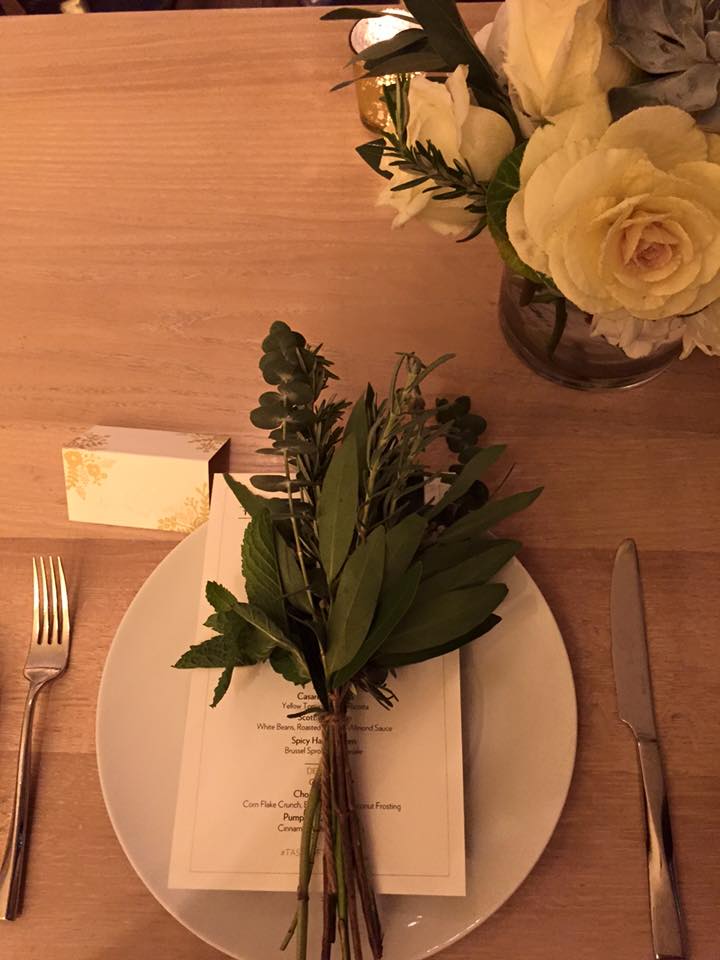 Sitting down at the table in the middle of the room, surrounded by a glass wall encasing some beautifully lit wine racks, Brandy was greeted by the fresh scent from a bouquet of herbs that had been set on each plate. She loved this touch, as it not only drew the attention to the table setting and then to the rest of the sparkling, sophisticated decor, but also set the tone for the fresh food ahead.