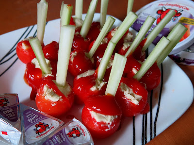 Cut the tops off of the tomatoes and use a spoon to scoop out the seeds and core. Using about 1/3 to 1/2 a wedge of The Laughing Cow® cheese, fill each tomato. Cut the celery horizontally into 2-3 inch long pieces, then slice them vertically until they are about 1/4 of an inch thick and place them into the cheese so they are standing up like the garnish in a bloody mary. Top each tomato with a drizzle of hot sauce and serve.