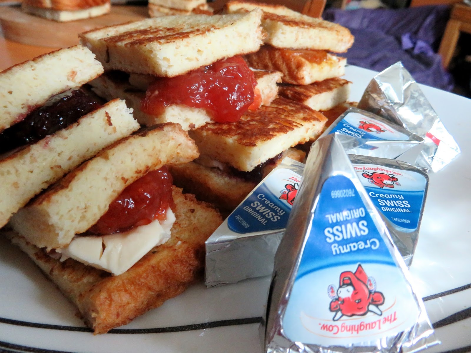 Cut each slice of French toast into 4 equal pieces. On two of the pieces, spread about 1/3 a wedge of The Laughing Cow® Creamy Swiss, then add your fruit spread of choice. Top with a second piece of French toast and serve.