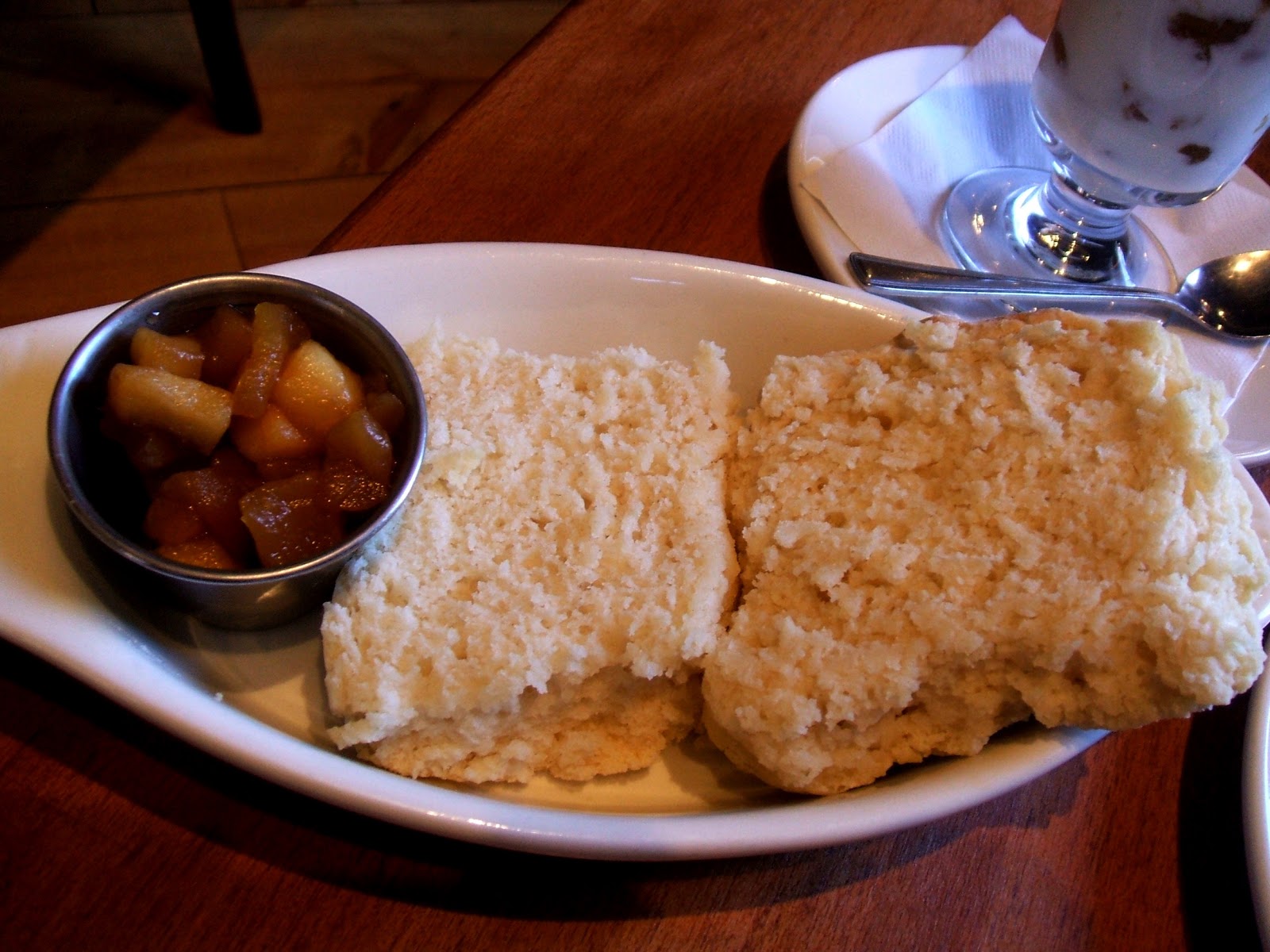 To finish off her rustic meal, Brandy ordered one of the house made Buttermilk Biscuits, which came with a bit of the same apple compote, but oddly no butter. The biscuit was rather huge; indeed, one side would have served as a good portion by itself. Brandy found it to be very moist and crumbly with a little bit of a salty hit on the tongue that matched well with the sweetness of the apples (Brandy would have preferred something she could have more easily spread on the biscuit, but there was no denying the two did taste perfect together).