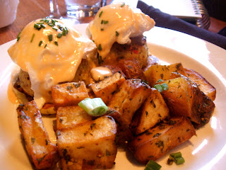 For her main course, Brandy eyed up the Jonah Crab Cake Benedict. While its true that Brandy has seen quite a few crab cake benedicts in her time, she had never seen one quite like this, coming adorned with a smoked tomato hollendais and chive belinis in place of the more traditional (and heavy) English muffins. Upon cutting into her eggs, Brandy was saddened to not see a heavenly cascade of yolky goodness. The eggs were still velvety, but a little too firm, and the yolks had solidified to the point of being almost hard boiled. The hollendais might have been too subtle for Brandy's palate, as she didn't seem to detect any of the supposed roasted tomato flavor, but the belinis did make for a nice change of pace. As for the crab cakes, Brandy found them tasty enough, but sadly lacking any crunch. Brandy had also ordered a side of grits, which seemed to have been replaced with potatoes. Glancing over her notes to try and remember if she really had decided on the grits, she soon gave up trying to decipher her own hideous handwriting and tried the potatoes. She found them a tad bit dry, but very flavorful, with a nice snap to their exterior.