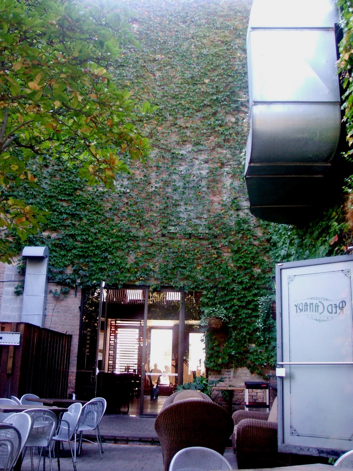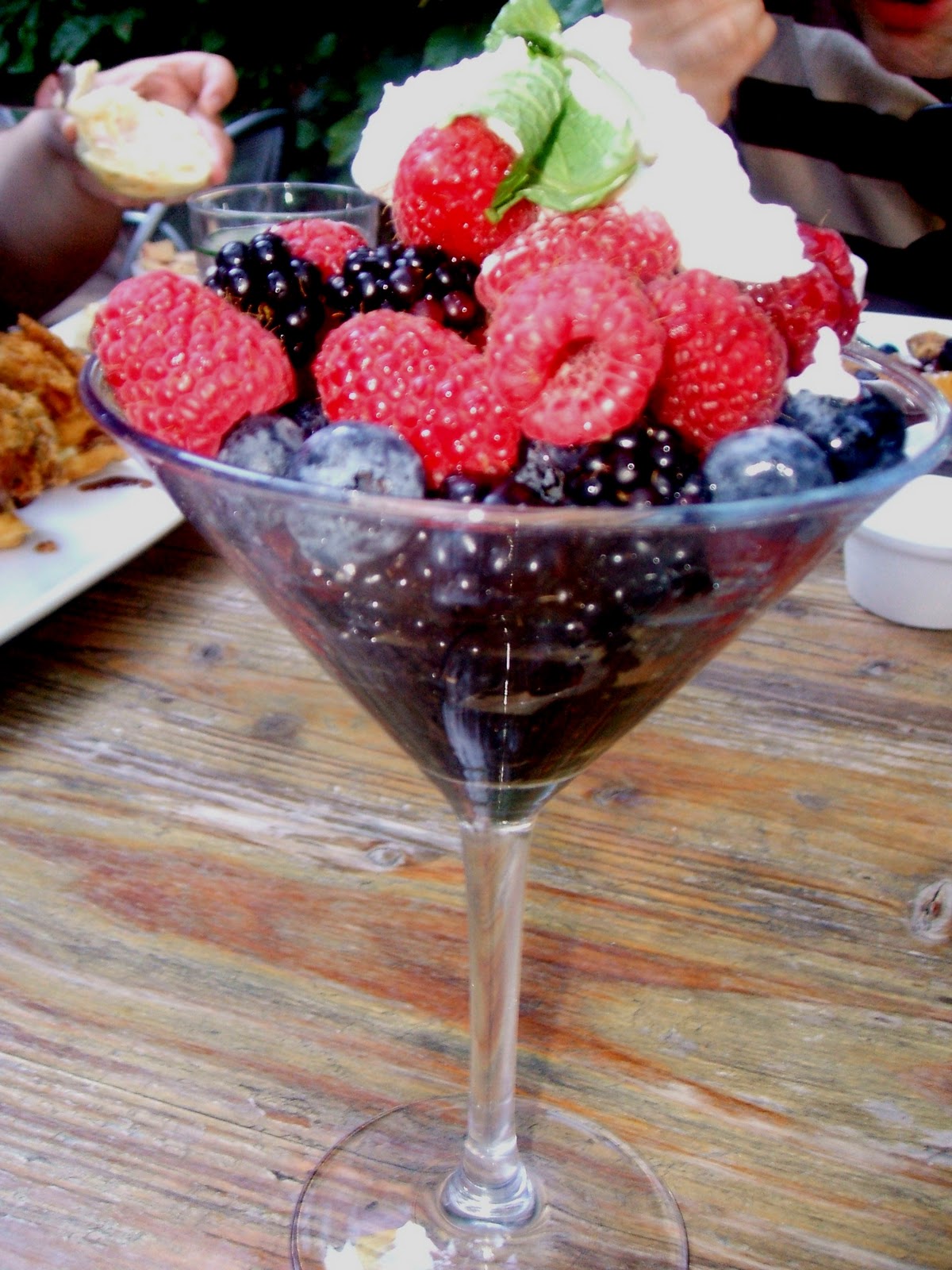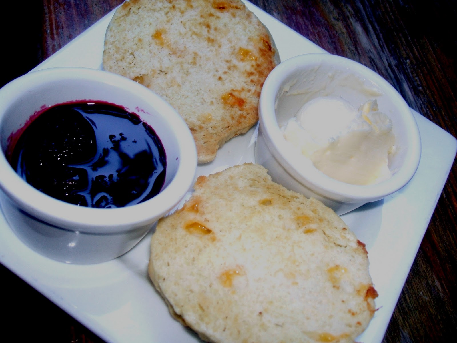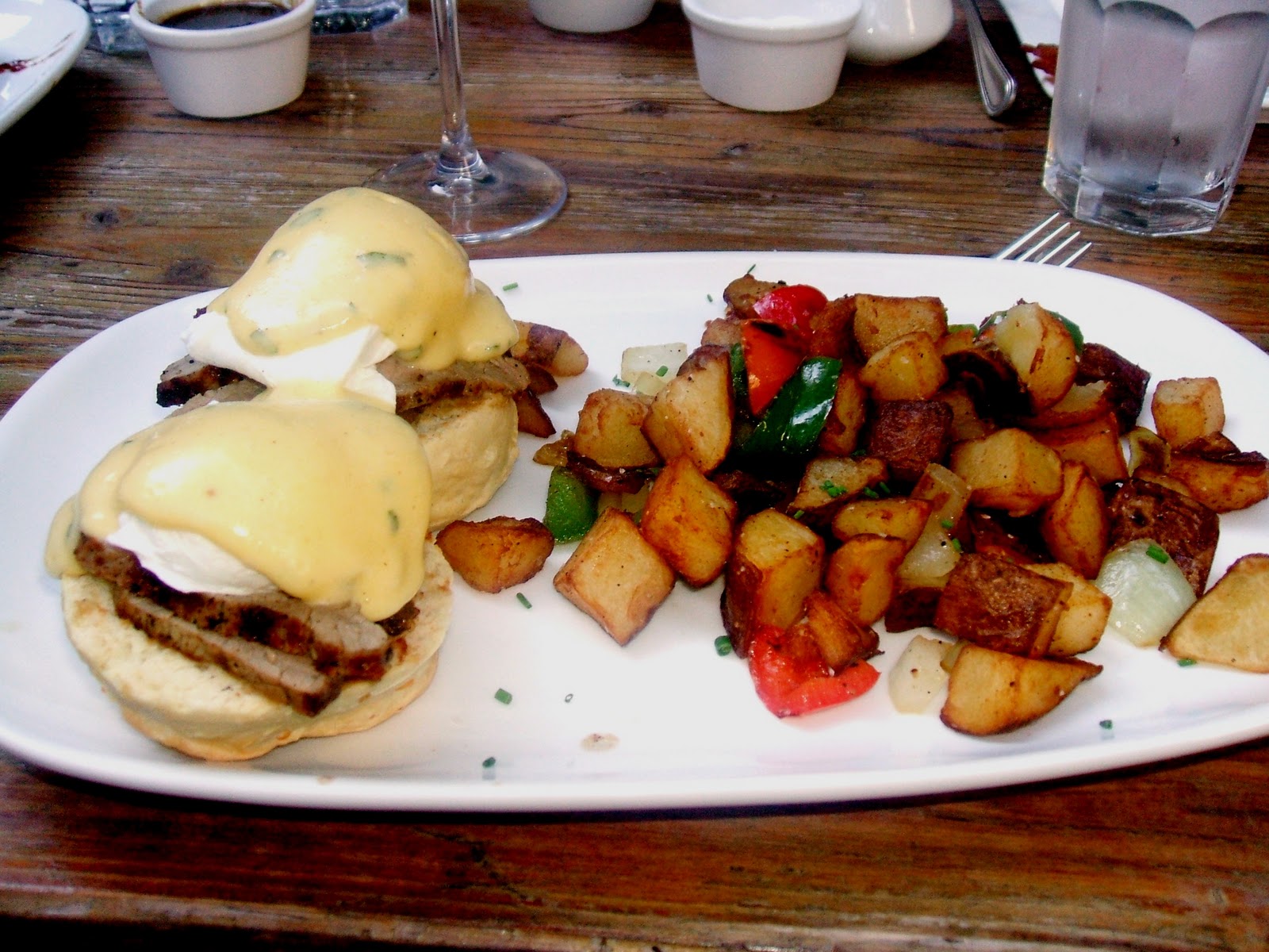 Brandy's choice was the Canary Benedict, with a dish called the Mixed Berry Martini on the side. The Martini, which despite its name was not a drink, was presented in a martini glass and consisted of a jumble of raspberries, blueberries, and blackberries which had been mixed with a sort of lavender-tasting syrup and topped with some vanilla whipped cream and a sprig of mint. While the berries were beautifully sweet, fresh, and bright, Brandy couldn't help thinking that $7 for such a dish was a little steep. The Canary Benedict, the house twist on the old favorite, was made with slices of steak in place of the Canadian bacon and a Cheddar Biscuit instead of the English Muffin. While the steak looked slightly over cooked (or perhaps had been sitting under a heating lamp too long?), it was still perfectly tender. The poached eggs poured their yolk over the biscuits, mixing with the sort of goopey and tangy herbed hollendais sauce. The biscuit was the true standout, being tender, light, and surprisingly sweet. The side potatoes were also a great surprise, being soft and perfectly spiced while being served up with peppers and onions for color and extra flavor.