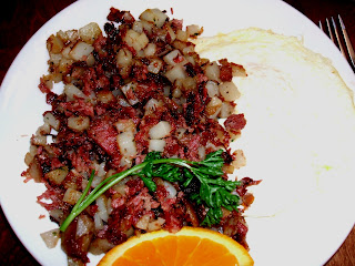 Brandy herself chose the Anders' Hash and Eggs. At the waitress's suggestion, she ordered the eggs over medium to retain the texture of the white with just a little runny yolk to mix with the hash. The hash itself was a lovely mix of salty corn beef and tender potatoes, which had a subtle herby flavor. The whole dish was wonderfully tender and filling, with a smartly placed wedge of orange to cut the fattiness.