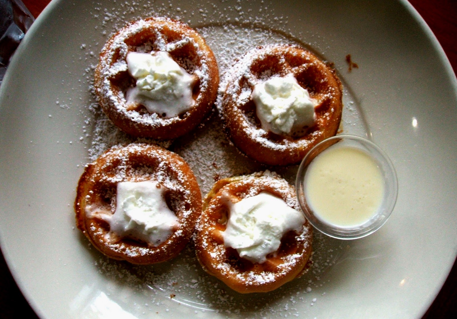 Brandy started off with an order of Mini Waffles, which came four to a plate, with whipped cream, powdered sugar, and a delicious vanilla sauce on the side for dipping. The waffles were perfect in texture, with a nice crisp outside and a light, airy inside. The sauce packed just the right punch of flavor, adding an almost fruity taste to the confections. But as Brandy's eternal war cry goes, a few pieces of fruit would have done wonders to heighten the taste.