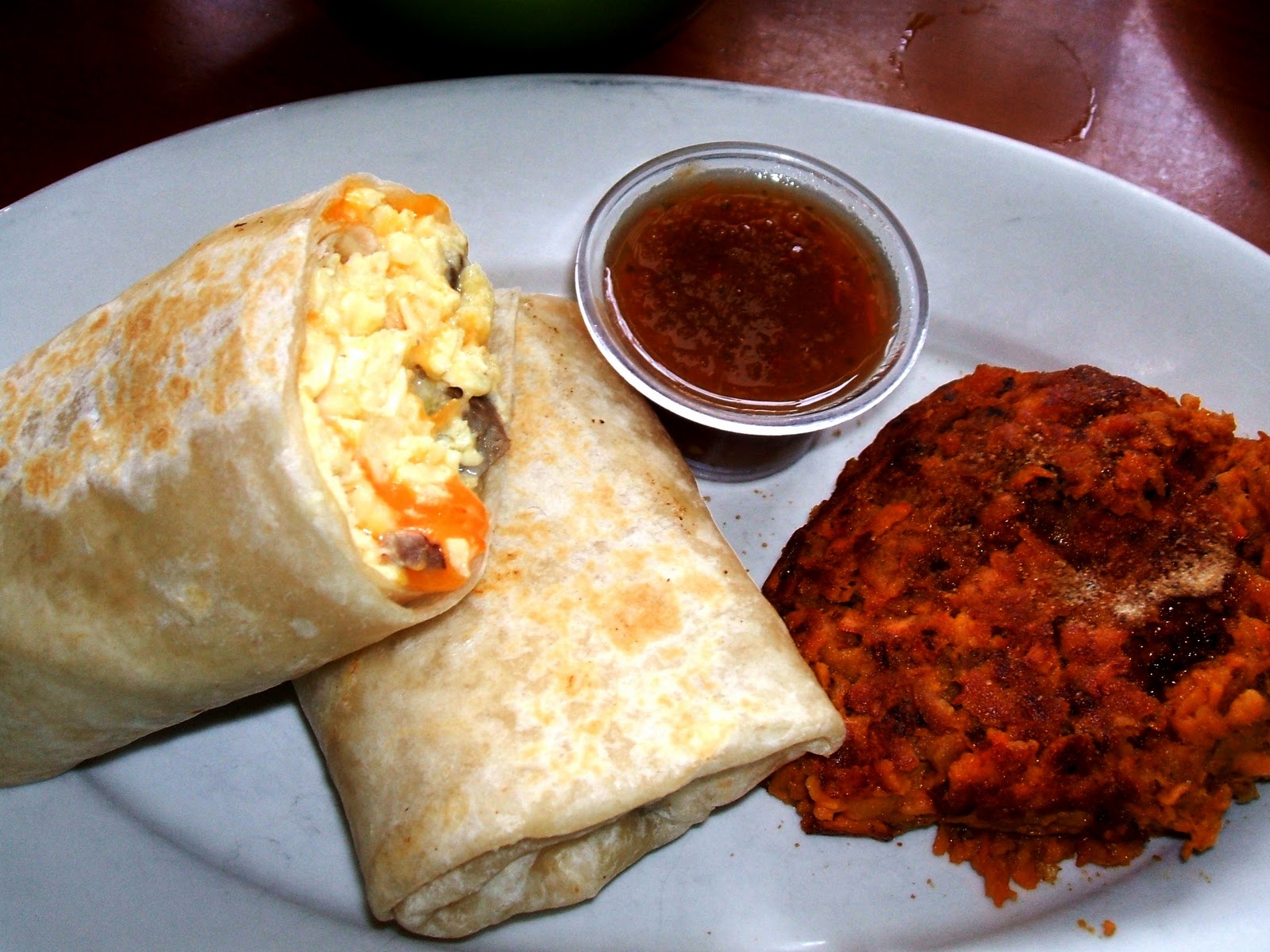 For her main course, Brandy chose the Brideport Burrito, a flour tortilla encasing scrambled eggs, cheese, and steak, which came served with her main reason for being there: sweet potato hashbrowns. Never before in the sea of potatoes that is Brunch, has Brandy ever heard of such a thing, which is exactly why she had to try them. The burrito itself, though the eggs were nicely fluffy and the cheese plentiful, was rather bland and dull. The steak used wasn't tender at all and had absolutely no flavor to it. The only saving grace was the side of house made salsa, which added a much needed kick to the dish. The hashbrowns on the other hand were anything but flavorless. Apparently the delicious smell Brandy had experienced upon entering stemmed from this lovely offering. Though not as crispy as she had anticipated, the texture of the hashbrowns seemed to fall somewhere between mashed and diced. A lovely sweetness came from the caramelized onions that were scattered through out, and the top of the mound seemed to glitter with sugar and cinnamon. Brandy's favorite memories of Thanksgiving and Christmas came flooding back with every mouthful.