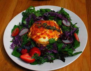 Bunny's crab cake sandwich was a little disappointing.  The cake itself tasted good enough, with only sweetness and no fishy notes, but was so tiny that it barely covered half the croissant it was served on.  Bunny had also requested bacon and avocado, half of which she received and half she had to ask the cheerful waitress for.  The consolation was that she received both a fruit cup and a small side salad, so her plate seemed to resemble a colorful garden.