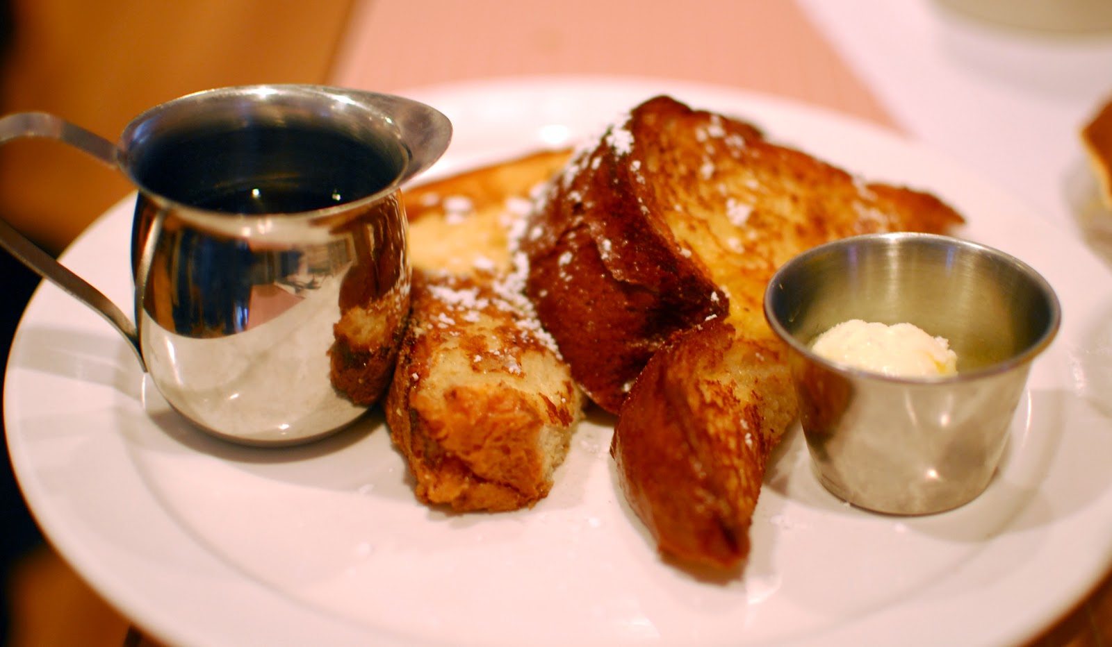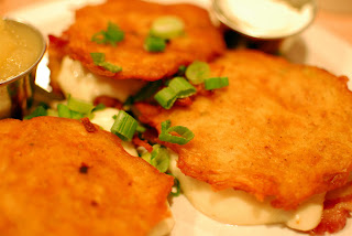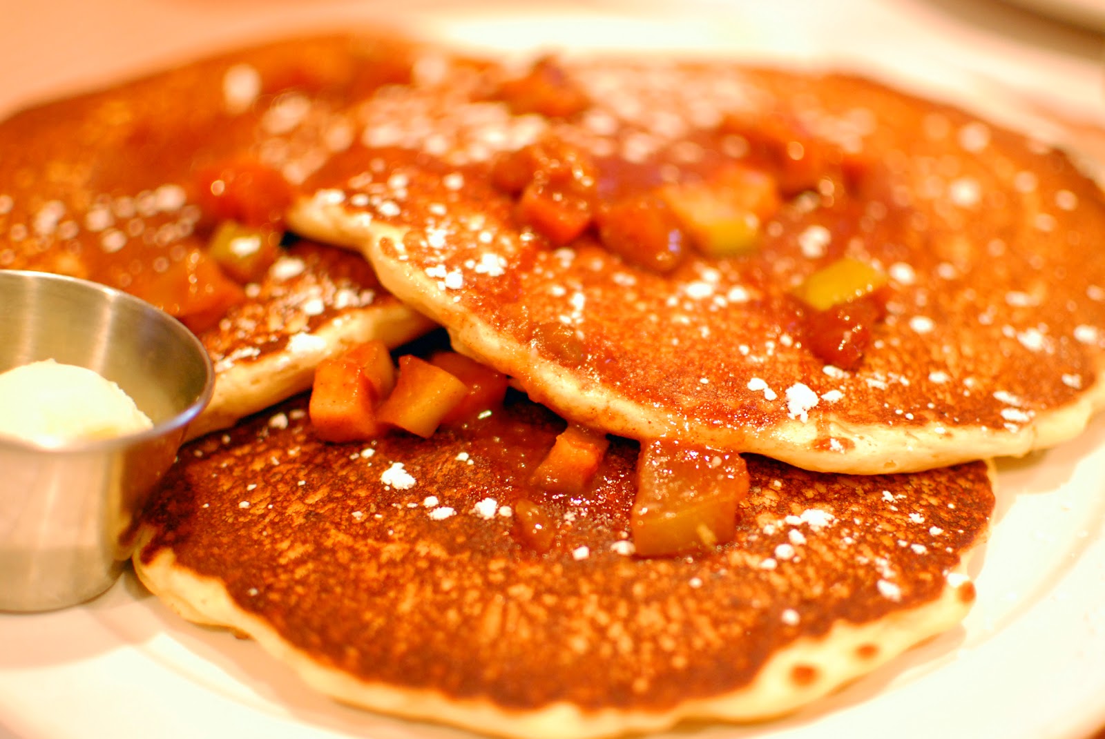 Bunny decided both her sweet ans savory cravings needed quenching, so she ordered Stuffed Potato Pancakes and Taffy Apple Pancakes. The stuffed potato pancakes came plated more as little sandwiches, with the pancakes forming the bread and mozzarella cheese and bacon as the filling. A delicate balance must have been employed not to render them too greasy, but they were decidedly rich. The Taffy Apple Pancakes on the other hand were a tad lacking. Though the pancakes themselves were fluffy, not too dry, and tasted of cinnamon, there was not nearly enough of the apple and caramel topping to render them interesting for more than a few bites.