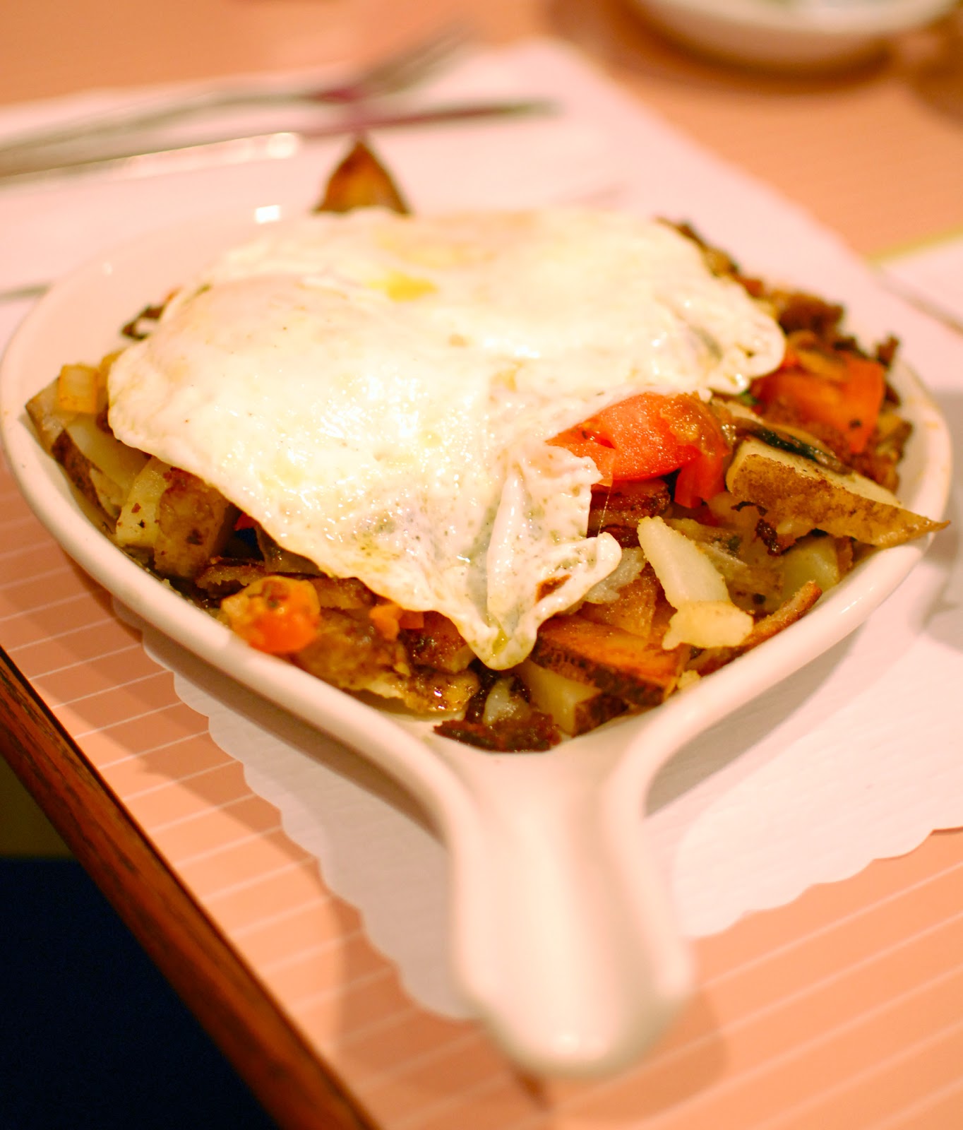 Betty Blanco ordered a Skillet Breakfast, complete with eggs, potatoes, meats, and veggies. It was a filling selection indeed, though she did insist that the individual components were rather bland. It was only upon combining them together that the dish began to come alive. "Not quite what I'm used to, mind," she said, "I've been cooking over a camp fire in the wilderness for the last 5 years. Things just don't taste the same to me if they haven't been roasted over pine cones."
