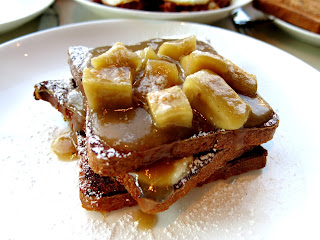 To end the meal on a sweet note, the ladies shared a plate of the Stuffed Apple Cinnamon French Toast. Once again, a perfectly good dish seemed to have been mis-named, as the toast was more stacked than stuffed, with the filling sandwiched between slices rather than being on the inside of the them. The French toast itself was really quite perfect in its custardiness, a flavor sometimes taken for granted in other fancy-fied French toasts. The apples retained a bit of their texture and tartness, the sauce's sweetness was not over powering, and marscapone cheese lent a brilliant bit or richness and creaminess to the plate.