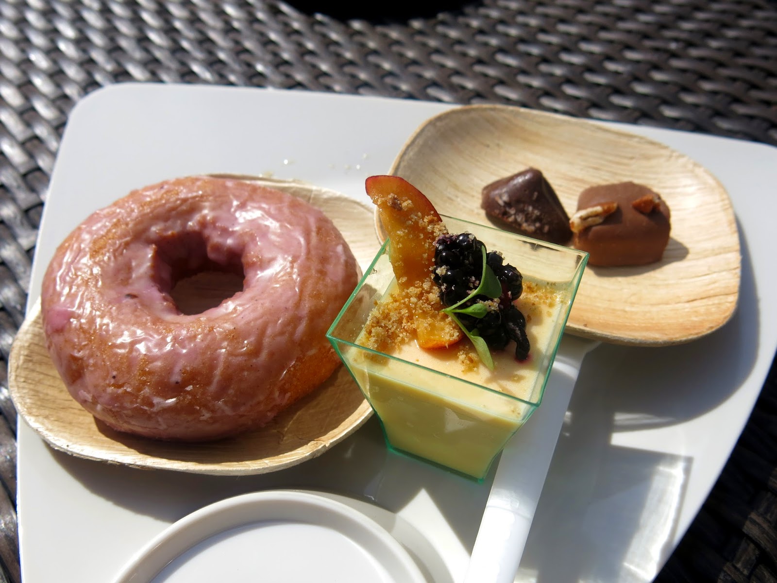 Dessert seemed to have a particular emphasis this year, as Brandy was very pleased to see. Donuts were at the forefront, with Glazed and Infused bringing a goat cheese and red wine glazed cake donut, Firecakes giving attendees the choice between a vanilla, chocolate, and "almond joy" flavored, custard filled yeast donuts, and Stan's Donuts stealing the spotlight with their Chicago Mix donut, which was topped with caramel corn and filled with a cheddar cream. "Not sure how I feel about this one," Brandy said, studying the neon orange interior of the pastry, "But it certainly is unique!" Other sweet favorites included Bistronomic's version of a Kit Kat bar, composed