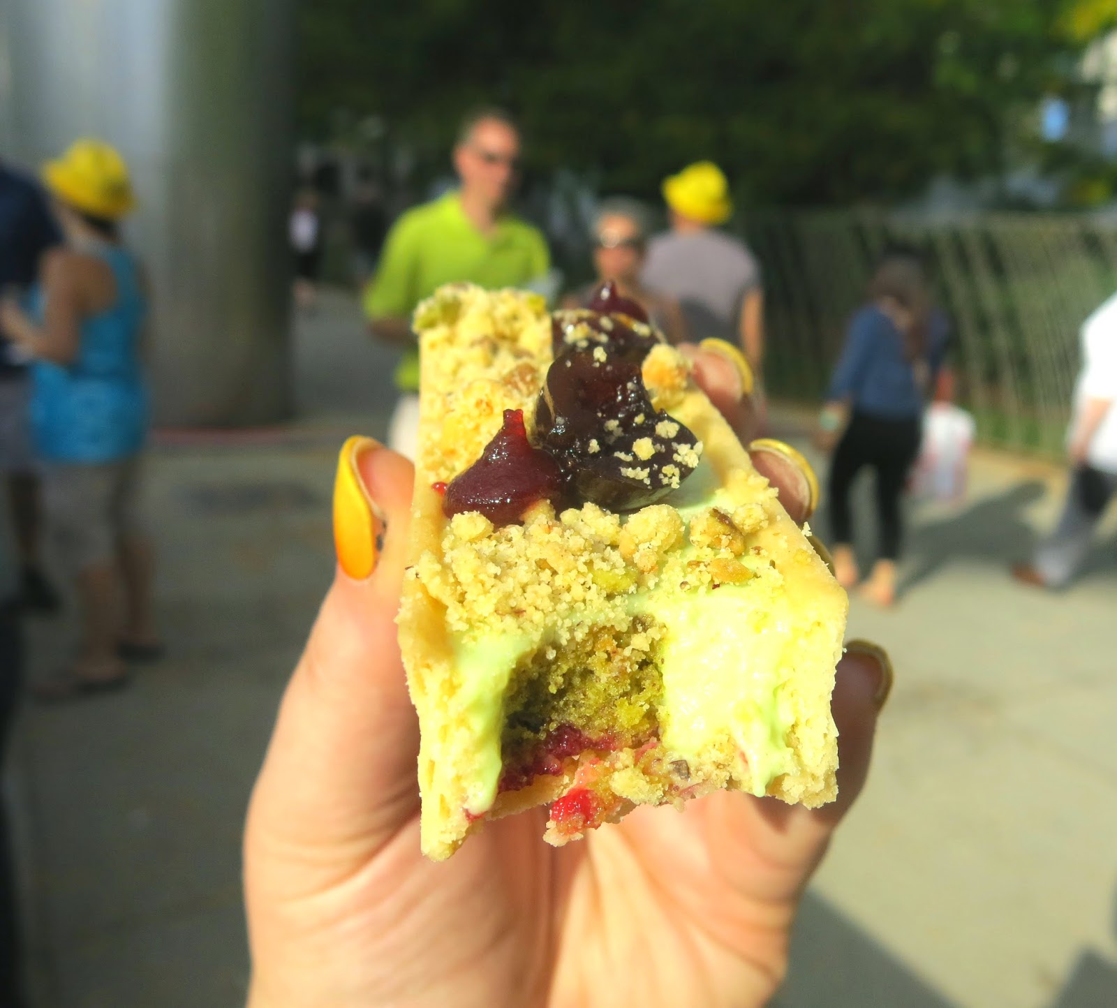 of feuilletine, chocolate hazelnut ganache, and served with orange Grand Marnier sauce and The Langham's pistachio and cherry tart, which was a such an intricate dessert that the station displayed one of the desserts cut in half to show all of the layers inside. Another major crowd favorite was surprisingly from Francesca's Restaurants, which brought a sweet corn butterscotch bread pudding with blueberries, caramel corn, and vanilla ice cream.